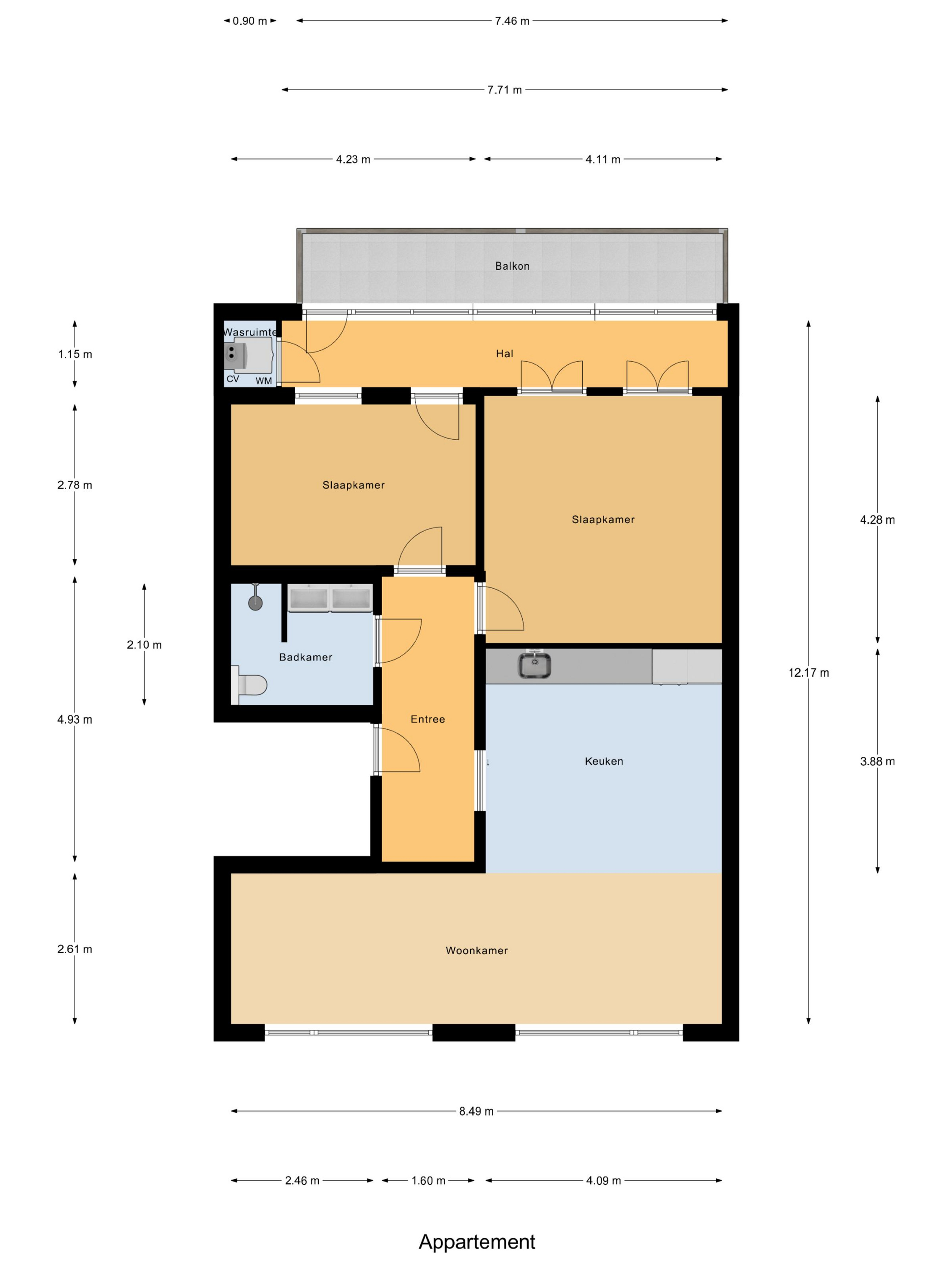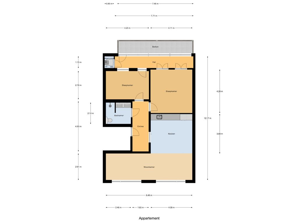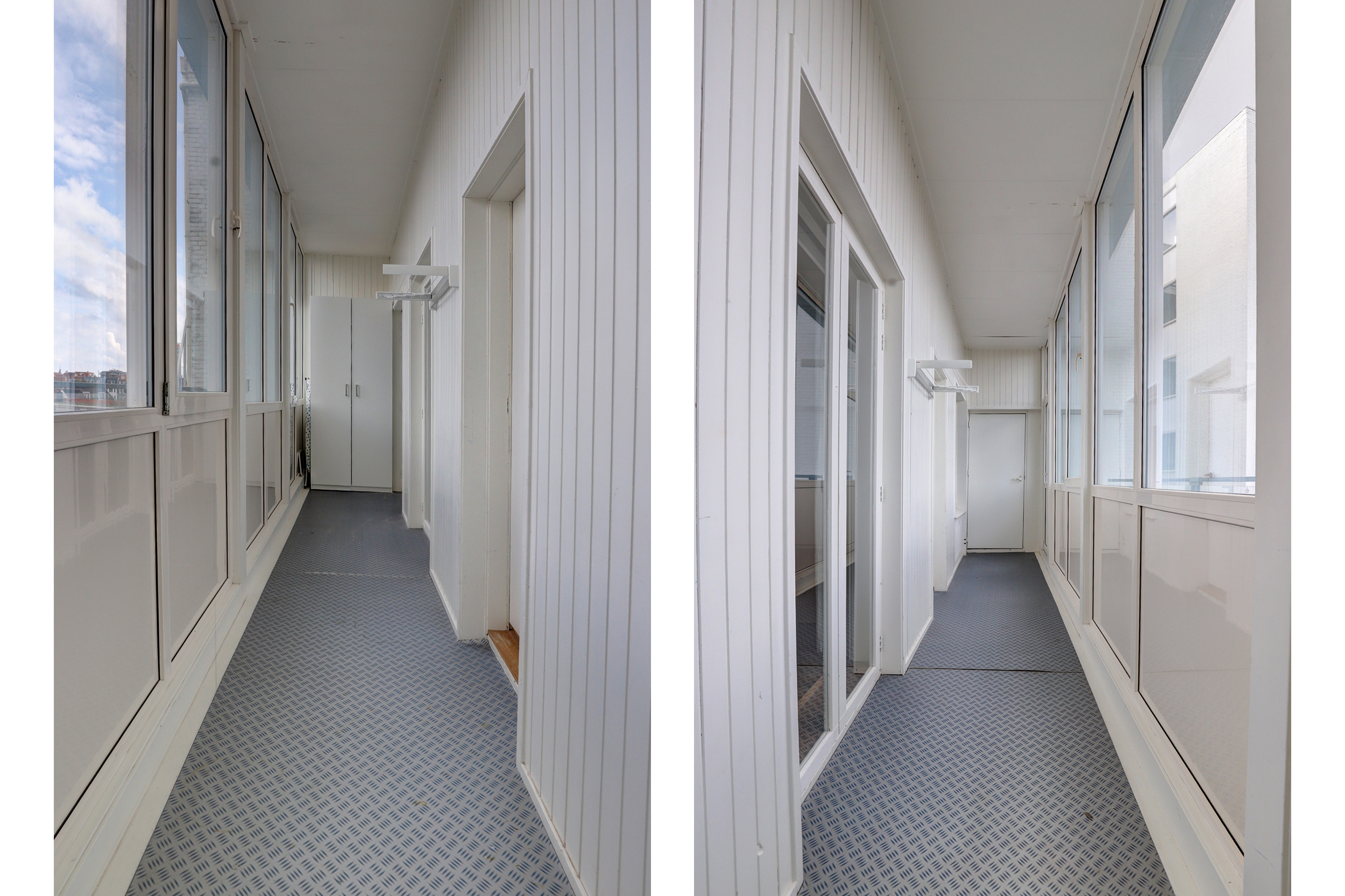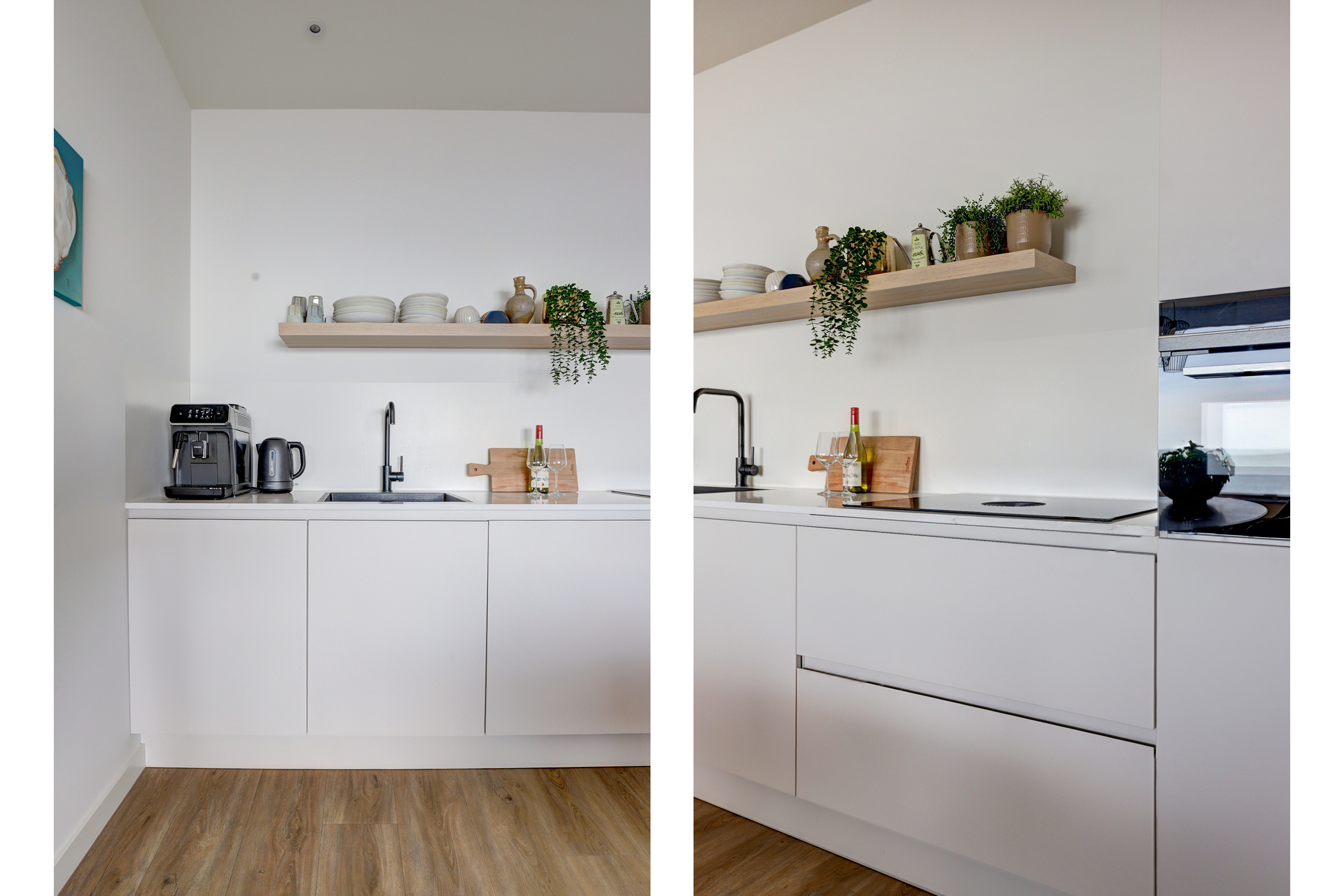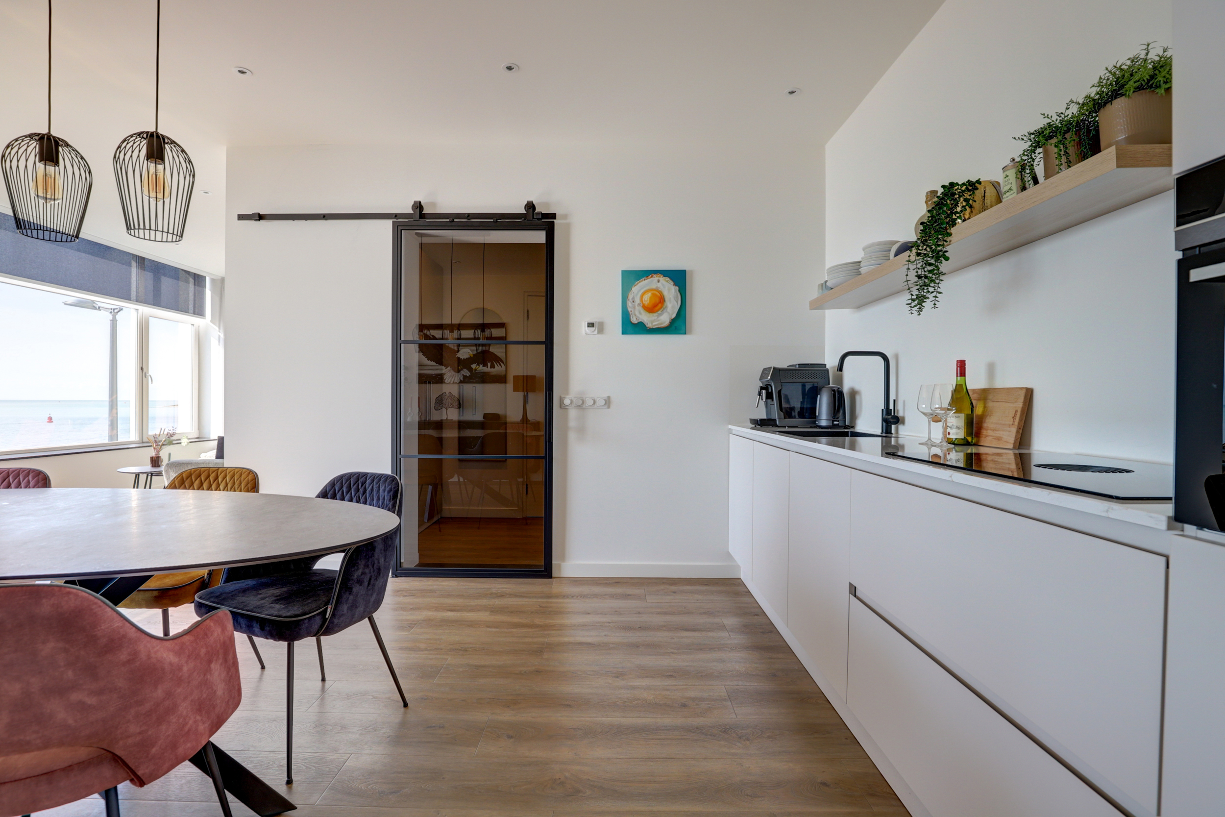 Via de entree betreed je de hal, die toegang biedt tot alle vertrekken. De ruime woonkamer ligt aan de voorzijde van het appartement en biedt een prachtig uitzicht op de boulevard. De moderne keuken grenst direct aan de woonkamer en is efficiënt ingericht met voldoende kastruimte en moderne inbouwapparatuur, waardoor koken plezierig en praktisch is.