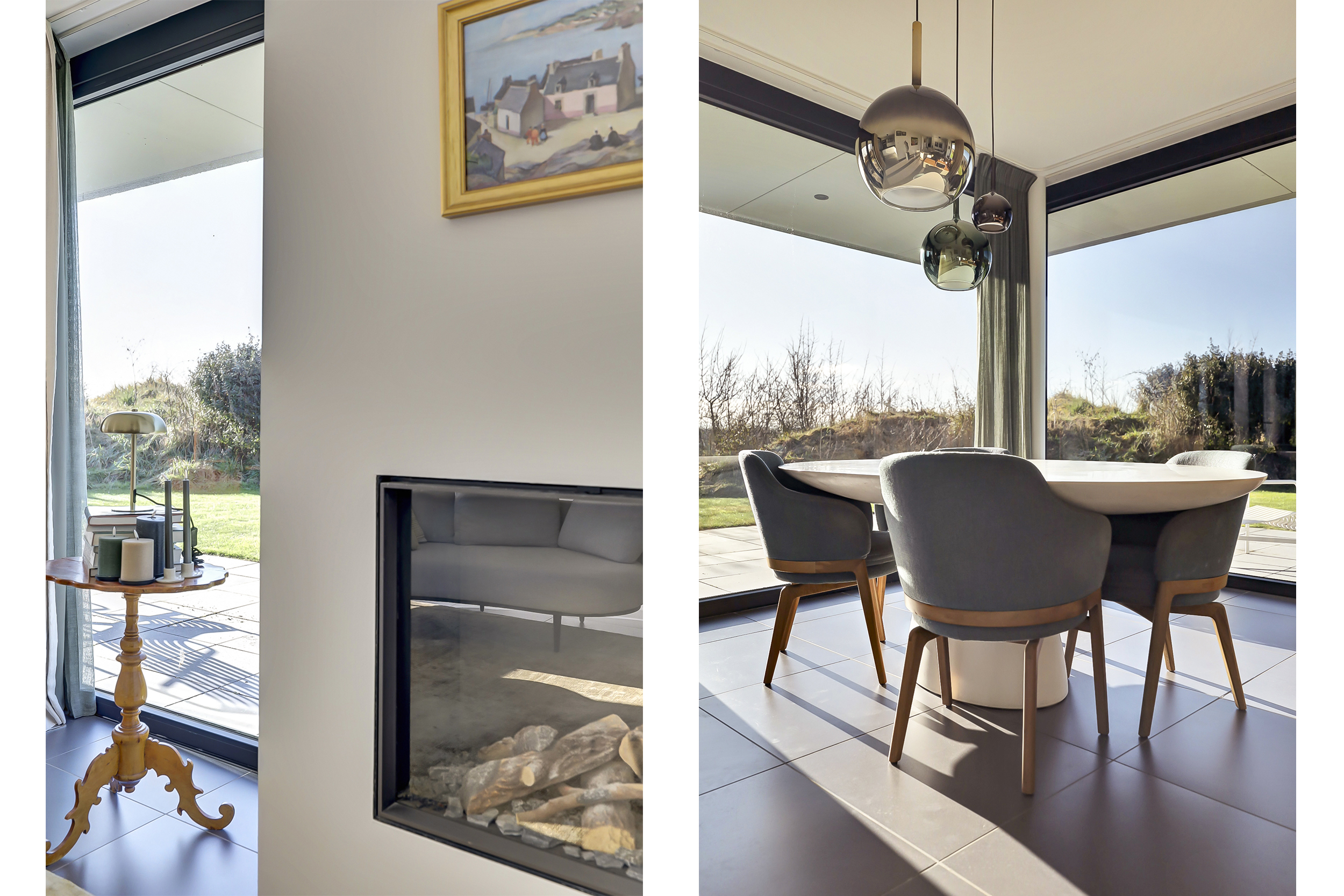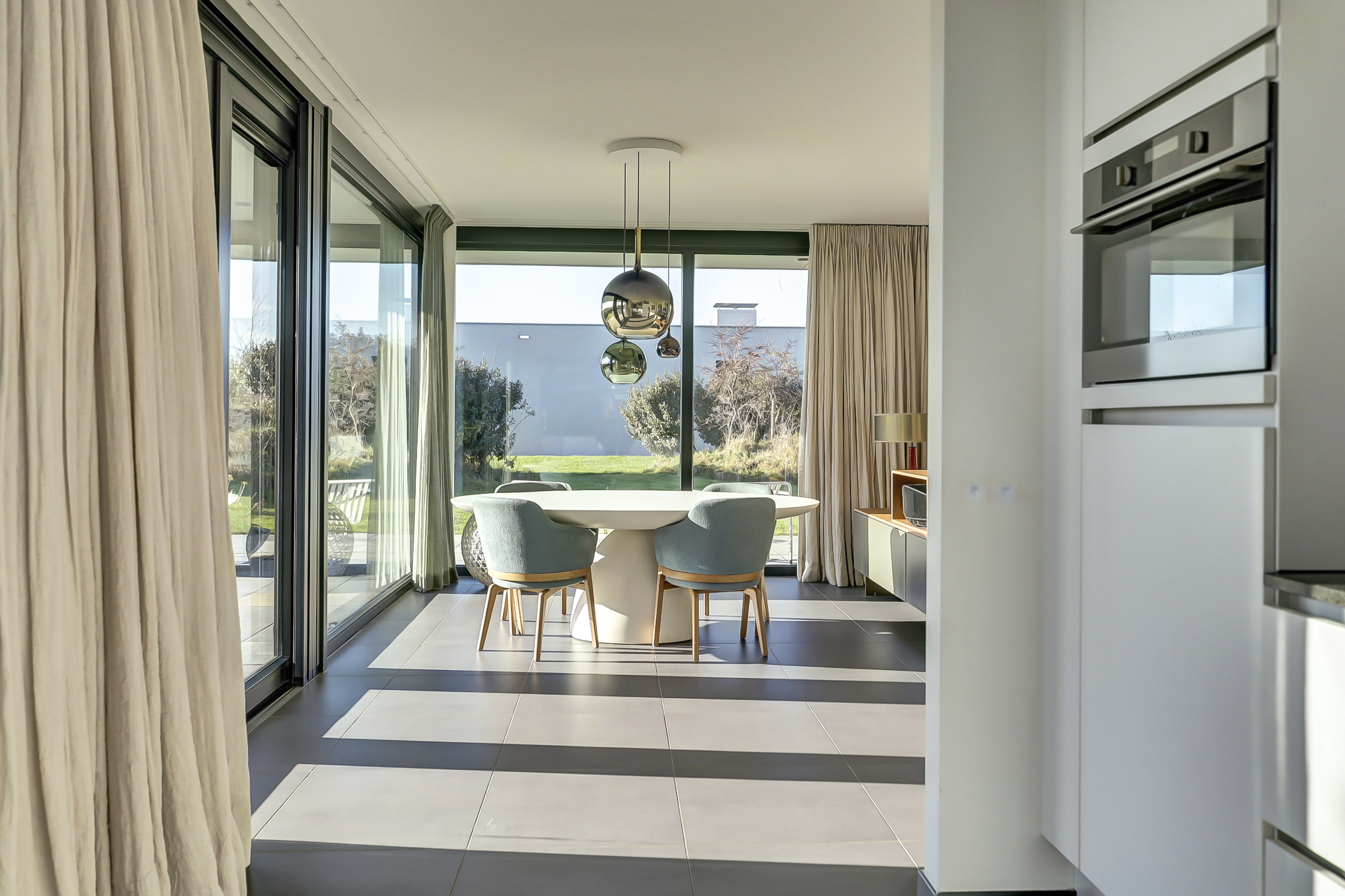 Beim Betreten gelangen Sie in die zentral gelegene Diele, die Zugang zu allen Räumen bietet. Das stilvolle Wohnzimmer ist offen mit der modernen, voll ausgestatteten Küche verbunden und bildet zusammen einen einladenden Wohnbereich. Die großzügige Glasfront sorgt für herrliches Tageslicht und einen nahtlosen Übergang zwischen Innen- und Außenbereich, was das räumliche Gefühl der Villa verstärkt. Luxus und Komfort gehen hier Hand in Hand, unter anderem dank des Gaskamins und der Fußbodenheizung. Über die Terrassentüren gelangen Sie in den sonnigen Garten mit XXL-Terrasse, teilweise überdacht und nach Süden ausgerichtet. Ein wunderbarer, sicherer Ort zum Entspannen, Spielen und Genießen mit der ganzen Familie.