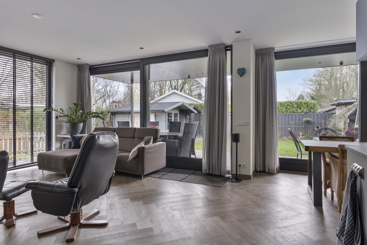 In diesem luxuriösen Haus mit einem Rauminhalt von ca. 399 m3 befindet sich alles auf einer Ebene. Außerdem verfügt es über eine stilvolle Einrichtung mit einem fantastischen, hellen Wohnzimmer, das durch die vielen Fenster immer einen Blick auf den umliegenden Garten und die Veranda bietet.