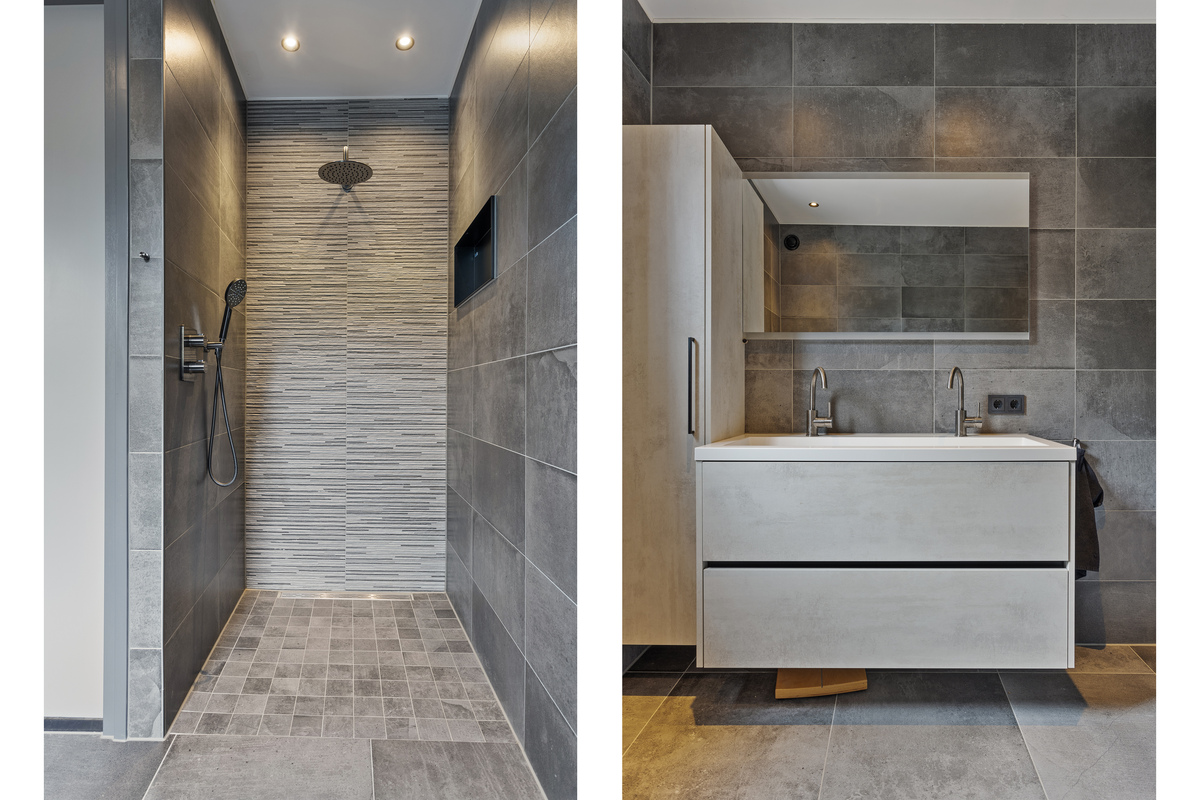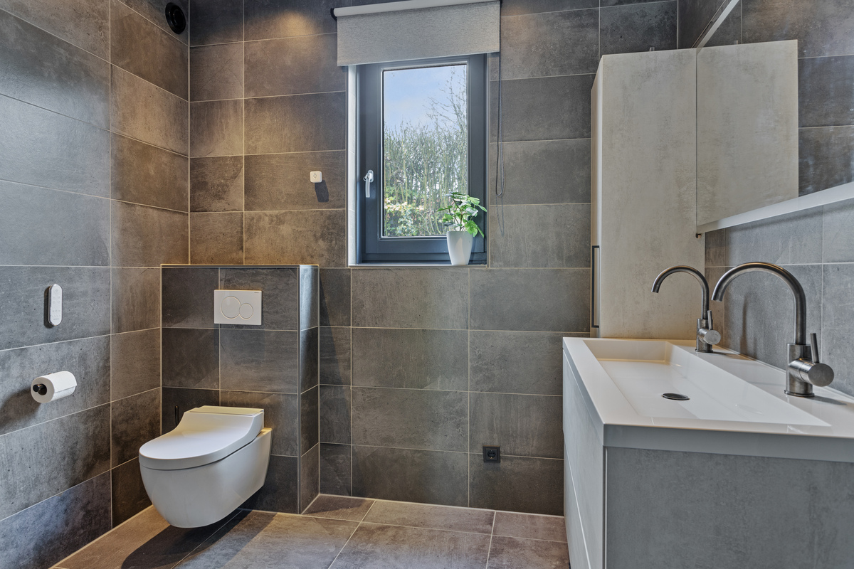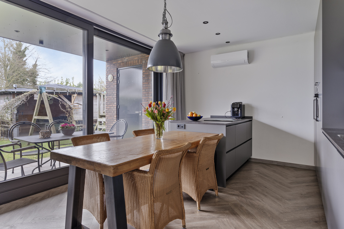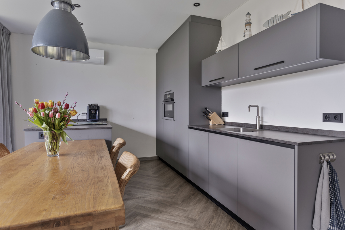 Sie betreten das Haus und kommen in eine geräumige Eingangshalle mit Toilette, Zählerschrank, Schrank, Zugang zum Wohnzimmer, Badezimmer und 3 Schlafzimmern. Das Wohnzimmer mit zwei Schiebetüren auf der Gartenseite bietet ein Meer von Licht. Es geht auch nahtlos in die Wohnküche mit Kochinsel und modernen Geräten, darunter ein Quooker, über.