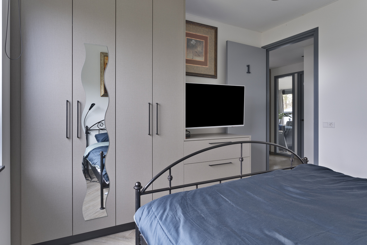 Der überdachte Abstellraum mit Wärmepumpentechnikraum bietet Anschlüsse für Elektrogeräte und viel zusätzlichen Stauraum. Das geräumige Badezimmer bietet zwei luxuriöse Waschbeckenschränke, eine Dusche mit Handbrause und eine zweite Toilette mit Duschfunktion. Außerdem gibt es drei Schlafzimmer, wobei das Hauptschlafzimmer mit einem Kleiderschrank ausgestattet ist. Das Vordach rahmt die beiden dem Garten zugewandten Seiten des Hauses ein und verfügt ebenfalls über einen Schrank zur Aufbewahrung. Hier erleben Sie auch an einem Regentag das erhabene Outdoor-Feeling.