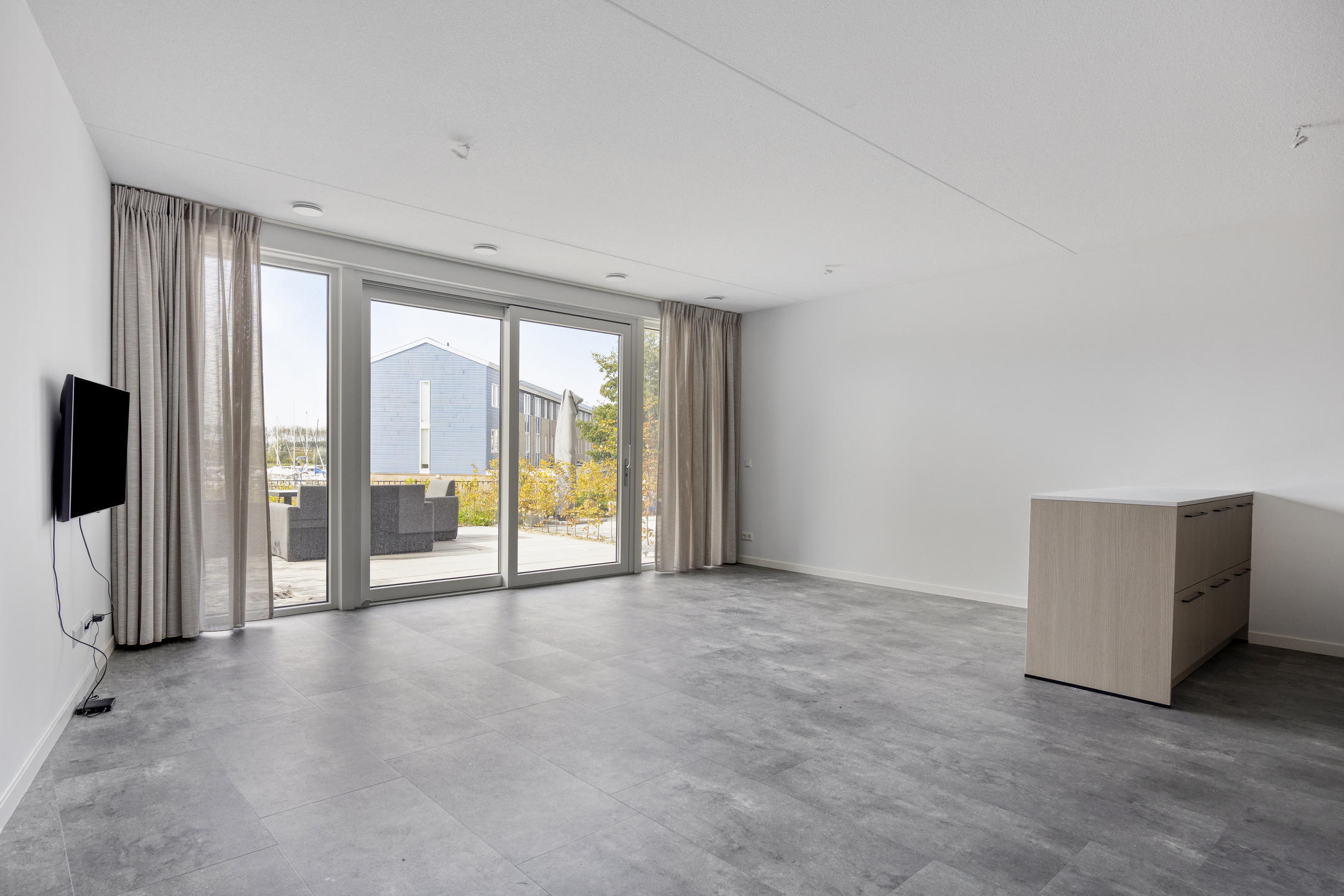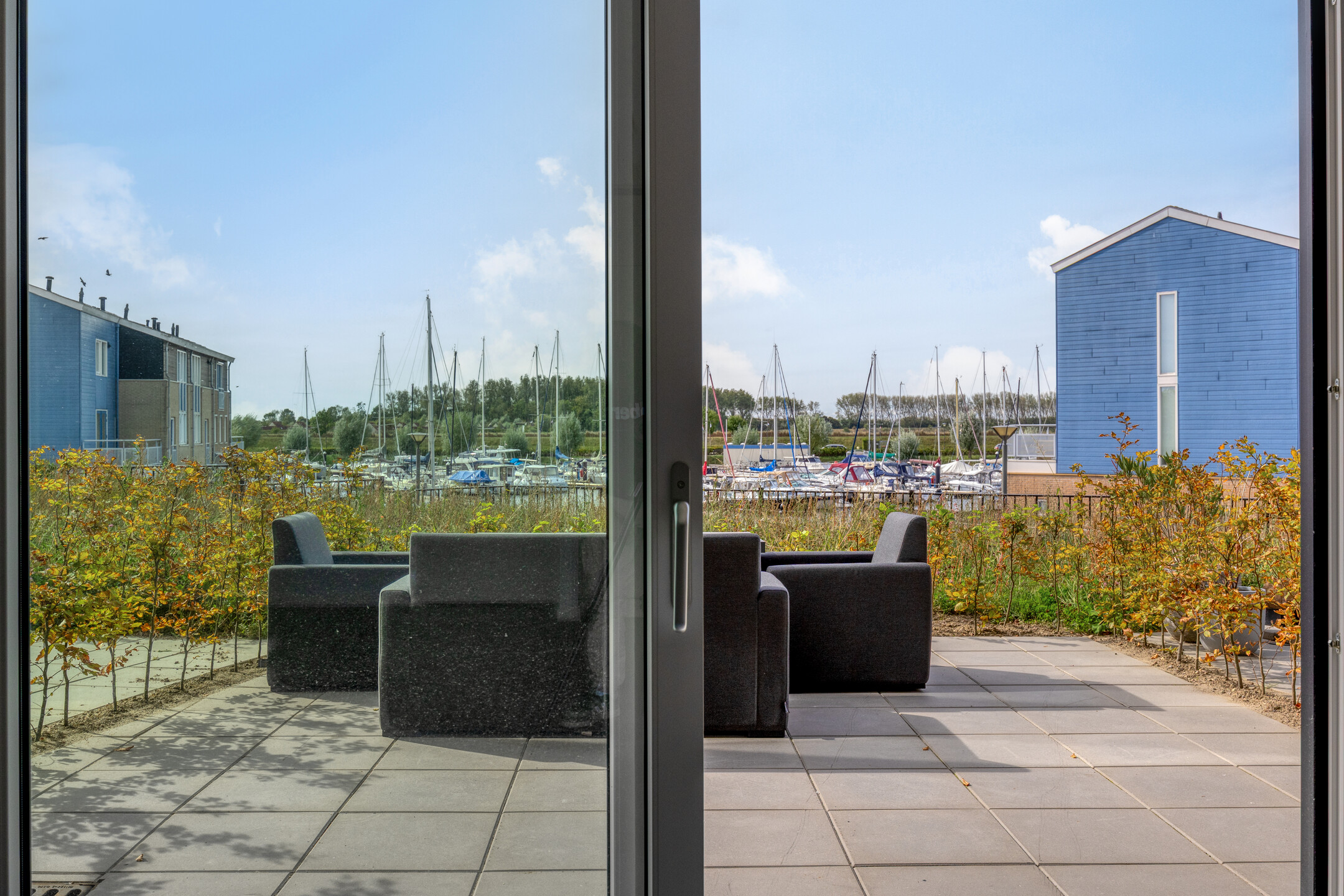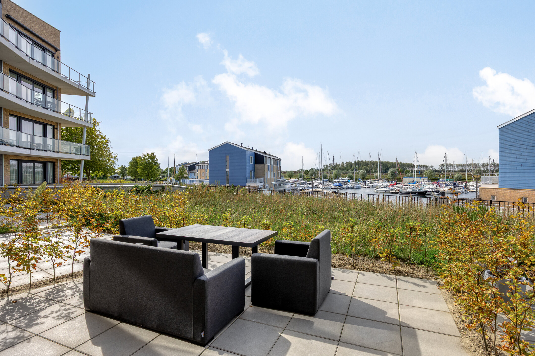 Bij binnenkomst kom je in een ruime entree die toegang biedt tot twee slaapkamers. Verderop in de hal vind je de berging met warmtepomp en wasmachineaansluiting, de meterkast, het separate toilet en de moderne badkamer. De badkamer is van alle gemakken voorzien, met een wastafelmeubel, een inloopdouche en een tweede toilet. De lichte woonkamer vormt het hart van het appartement en biedt via grote raampartijen een prachtig uitzicht op de haven. De moderne open keuken is voorzien van hoogwaardige inbouwapparatuur en sluit aan op de woonkamer, waardoor een open, sfeervolle leefruimte ontstaat. Via een schuifpui stap je zo het zonnige tuintje in, waar je kunt genieten van het water en de omgeving.