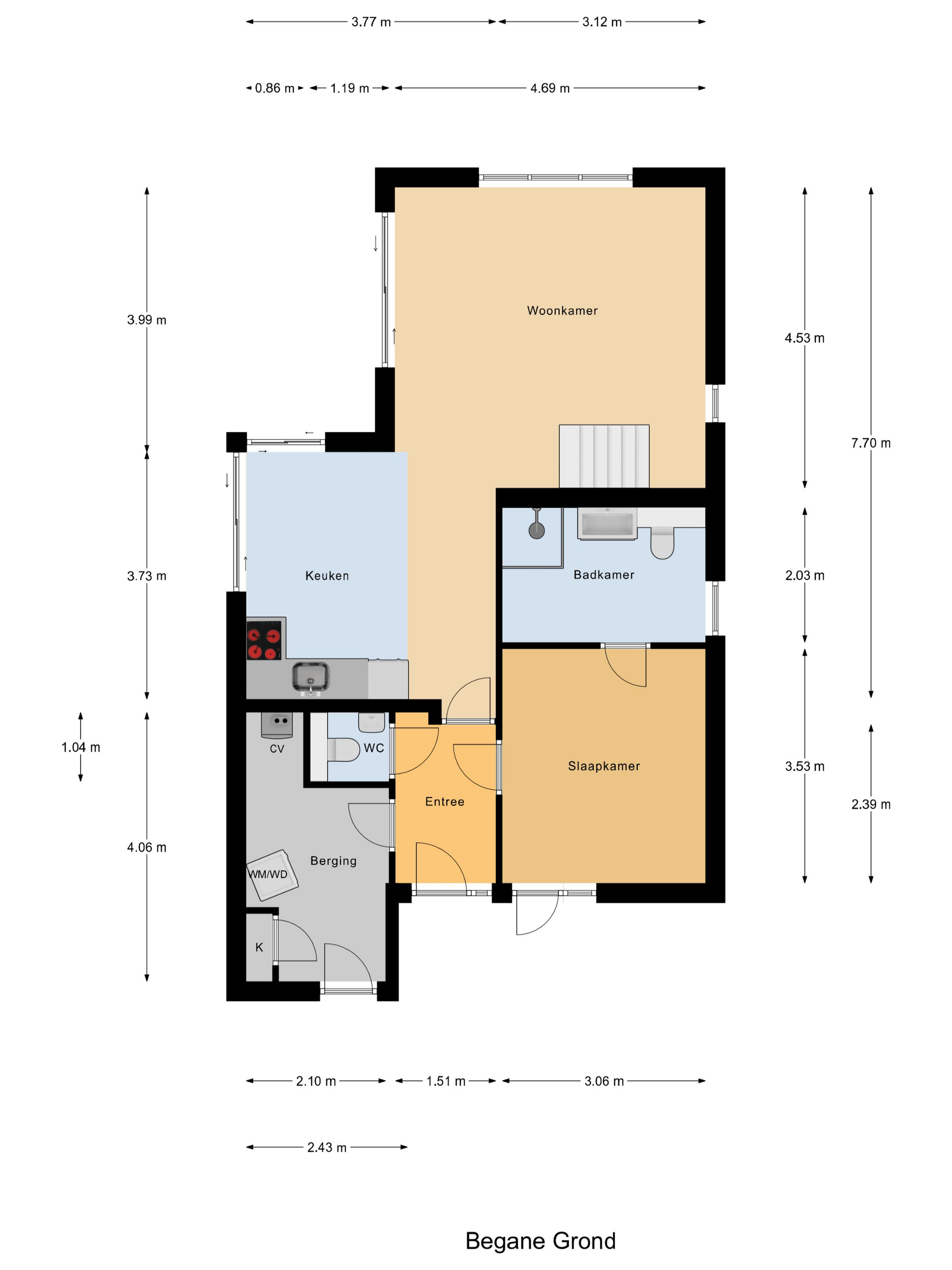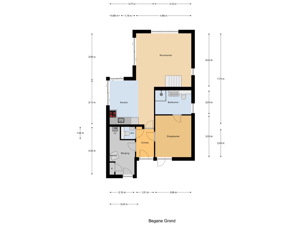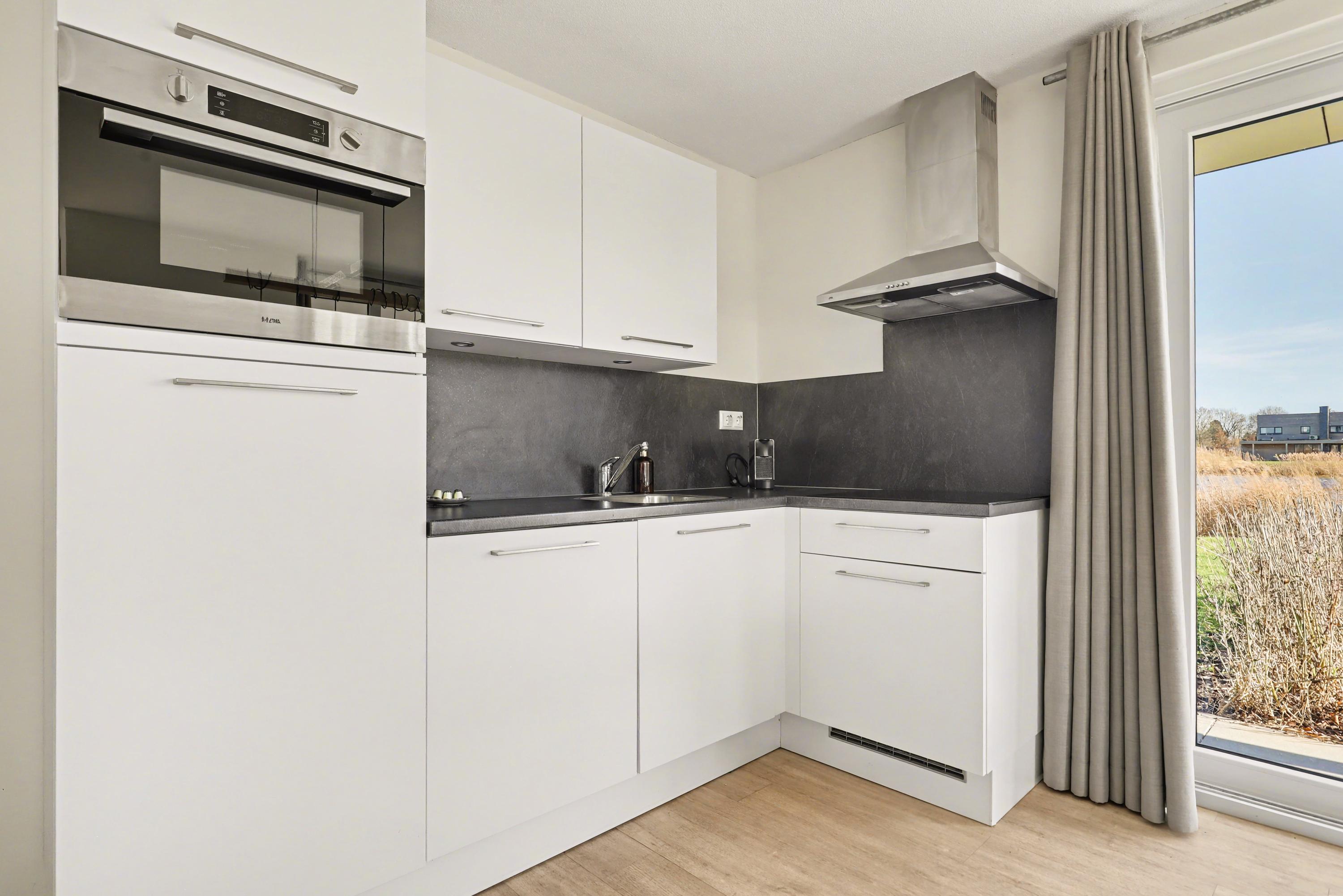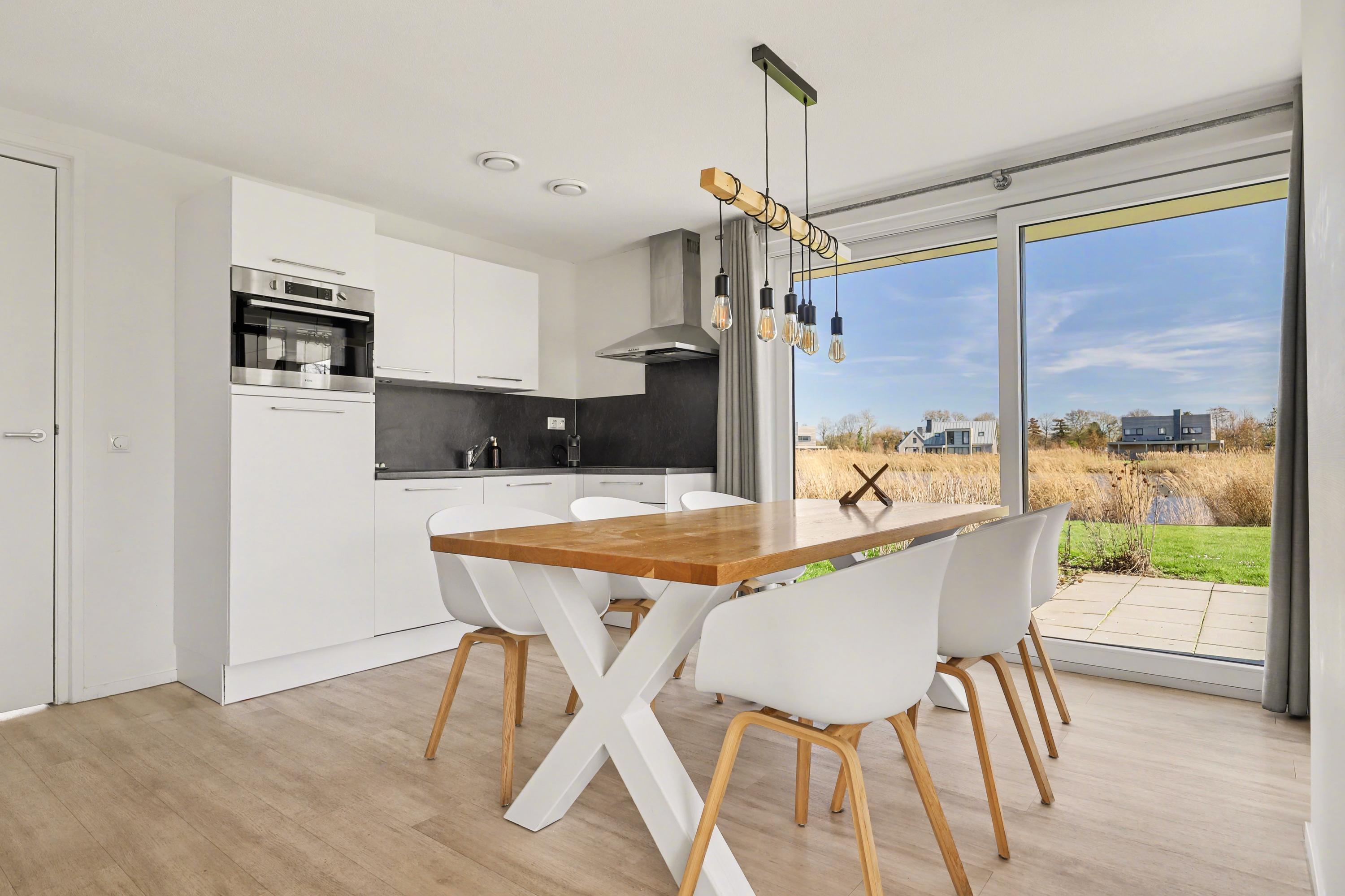 Via de entree kom je binnen in de hal met meterkast en toegang tot het separate toilet. De woonkamer bevindt zich aan de achterzijde van de woning en is gericht op de tuin en het water. Dankzij de grote raampartijen en de openslaande deuren naar buiten is er veel lichtinval en een directe verbinding met het terras. De open keuken is voorzien van een kookplaat, afzuigkap, spoelbak en diverse inbouwapparatuur. Op de begane grond bevindt zich een ruime slaapkamer. Aangrenzend ligt de badkamer, uitgerust met een douche, wastafel en toilet. Vanuit de hal bereik je tevens de inpandige berging, waar zich de cv-installatie en de witgoedaansluitingen bevinden. Deze berging is zowel van binnenuit als van buitenaf bereikbaar, wat praktisch is voor fietsen en extra opslag.