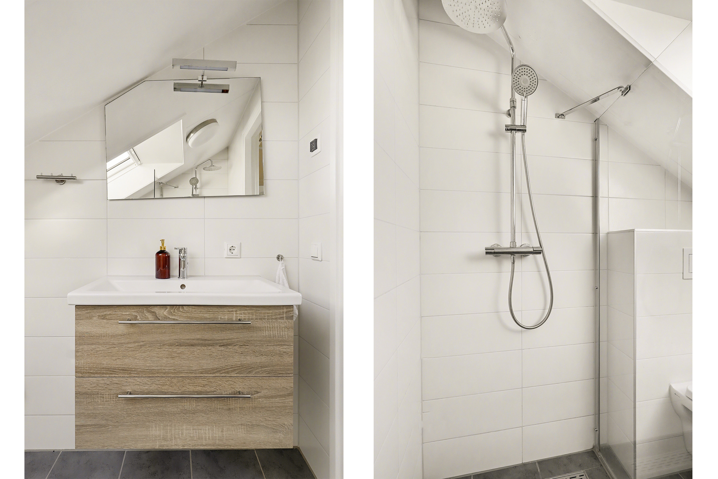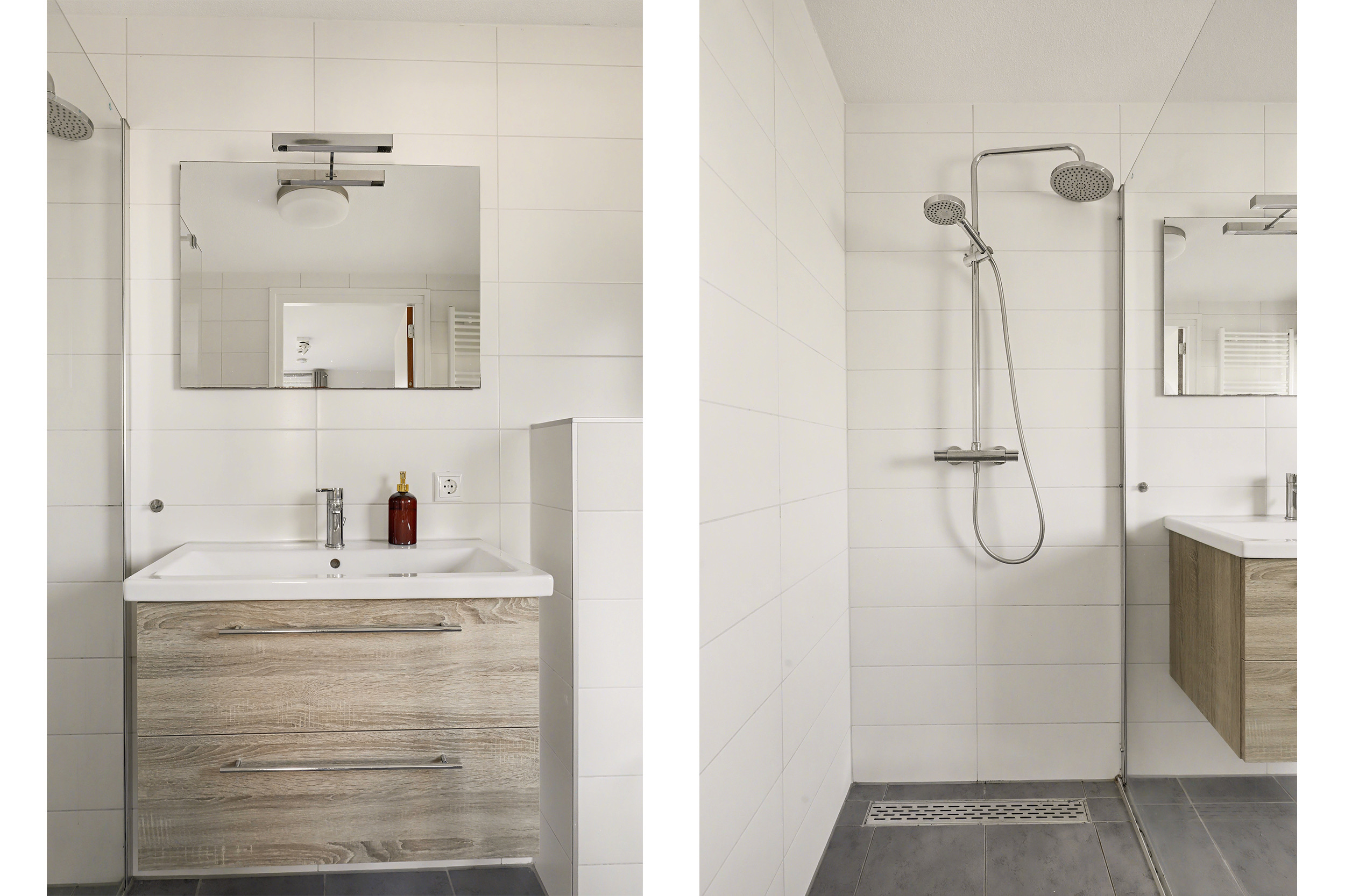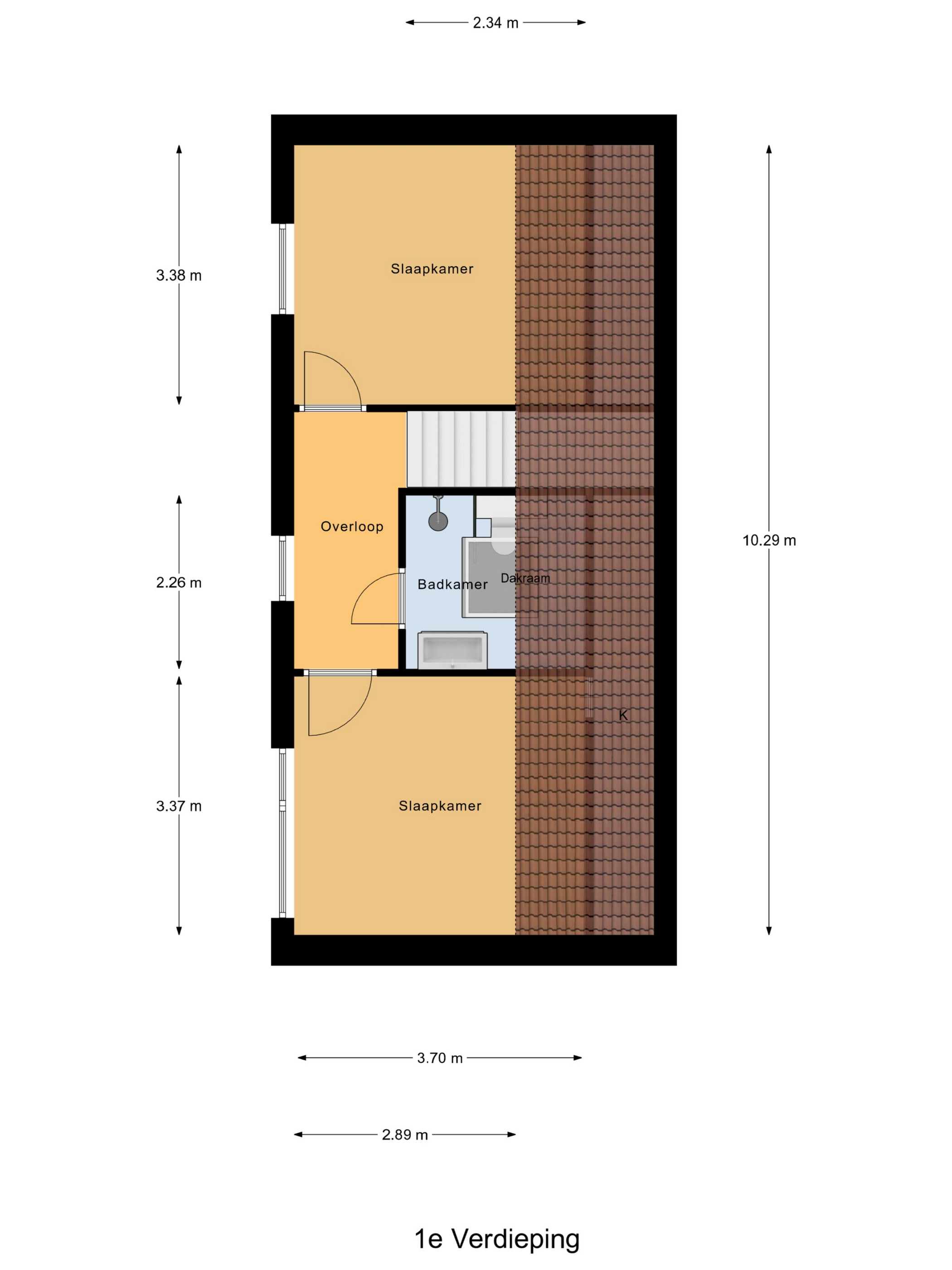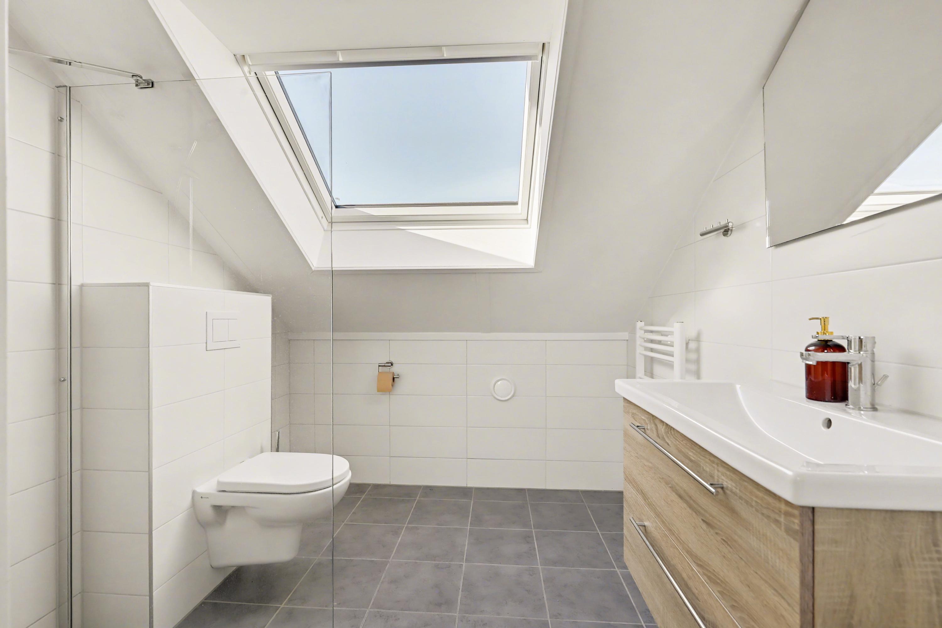 Via de vaste trap in de woonkamer bereik je de overloop op de eerste verdieping. Hier geeft de overloop toegang tot twee ruime slaapkamers. Op deze verdieping is een tweede badkamer aanwezig, voorzien van een douche, wastafel en toilet.