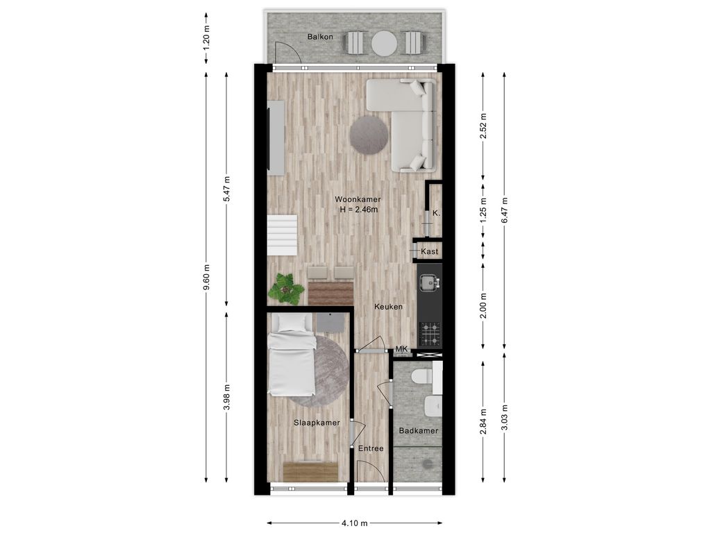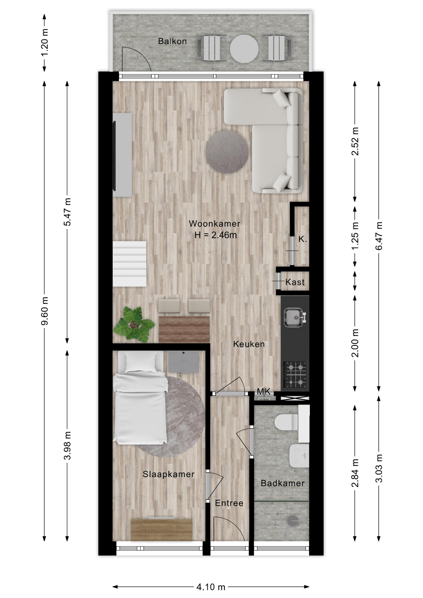 Via de entree heb je toegang tot de badkamer en de woonkamer met open keuken (appartement wordt opgeleverd in de staat staat zoals het nu is, dus zonder inbouwapparatuur). De badkamer is praktisch ingericht en voorzien van een inloopdouche, wastafel en toilet. De lichte woonkamer beschikt over grote raampartijen, extra kastruimte en een open keuken met inbouwapparatuur. Vanuit de woonkamer geeft een schuifpui toegang tot het heerlijke balkon (gelegen op het zuidoosten), waar je fijn buiten kunt zitten.