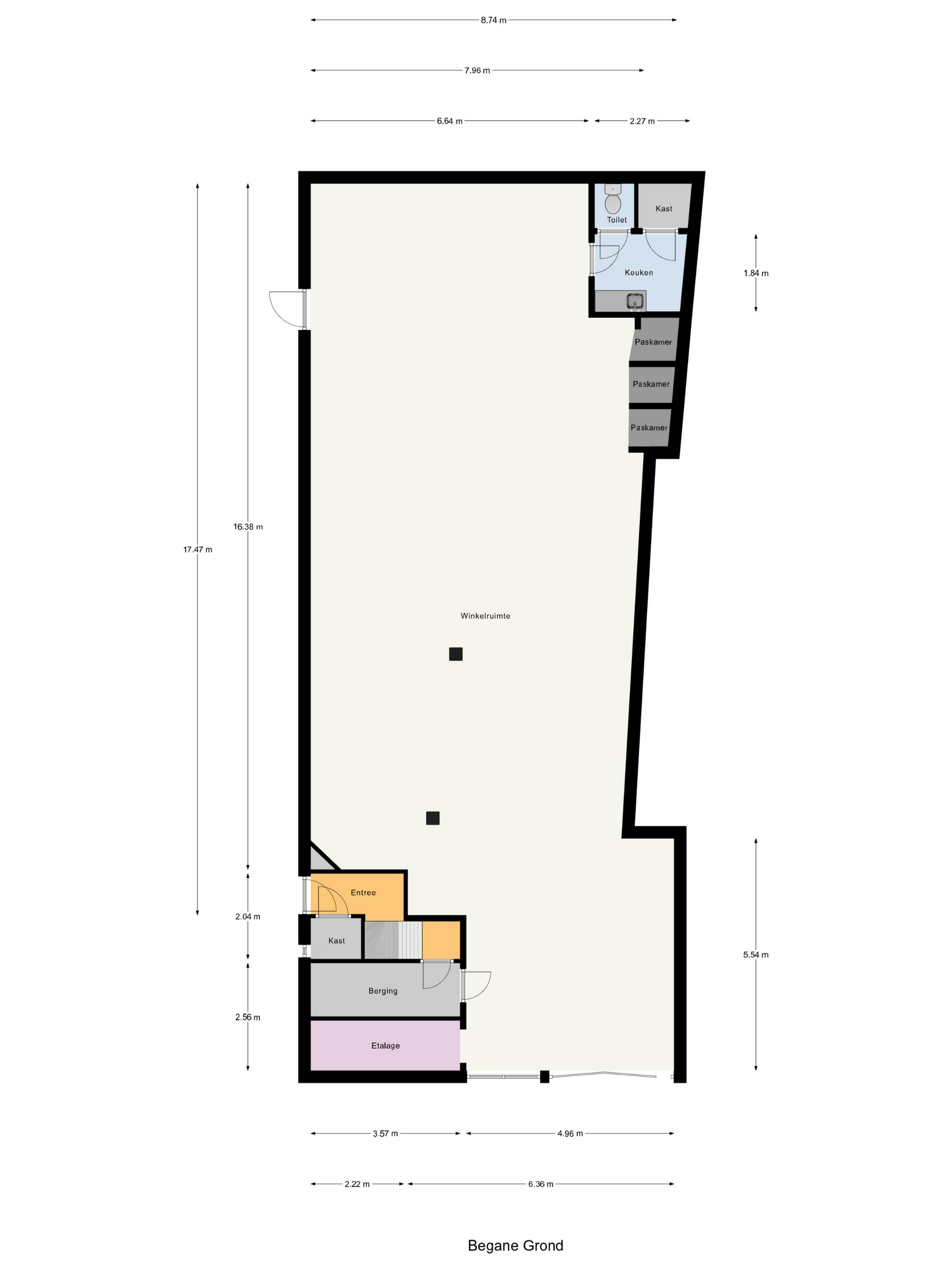 Het winkelpand is te betreden via de grote pui aan de voorzijde van het pand. Deze pui is vouwbaar en volledig te openen. Het winkelpand is goed opgedeeld. Aan de voorzijde is een etalage gerealiseerd, met daarachter een verborgen bergruimte. In deze bergruimte is een deur met toegang tot de kelder, wat eventueel ook te benutten is als bergruimte.