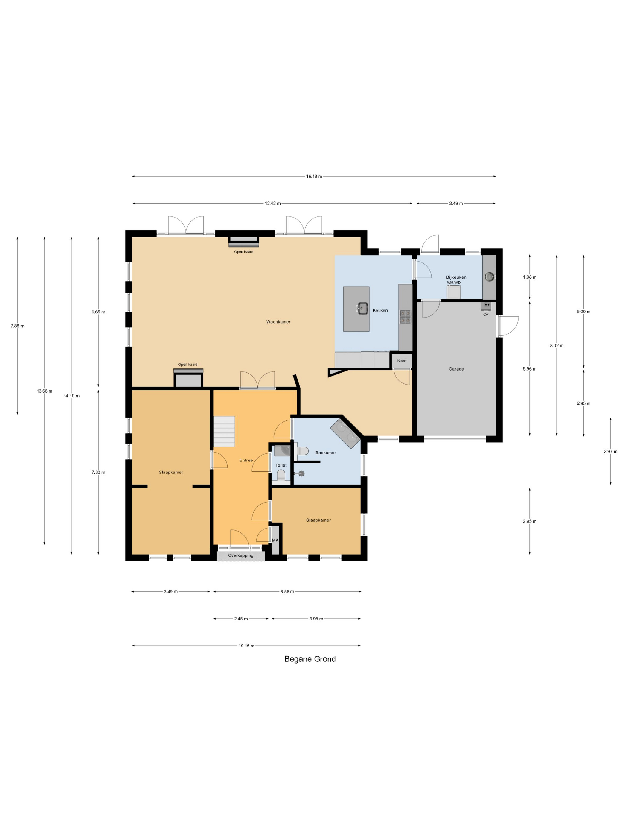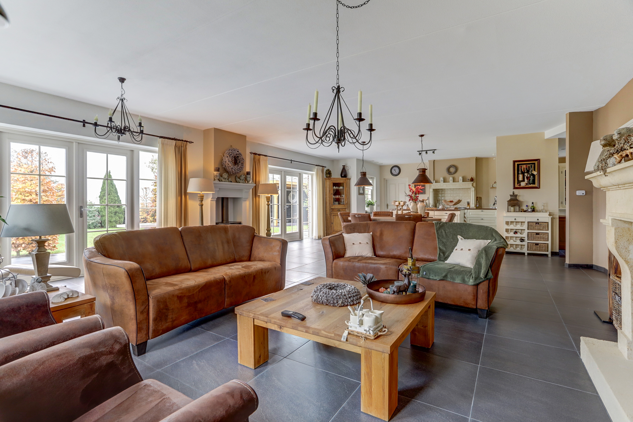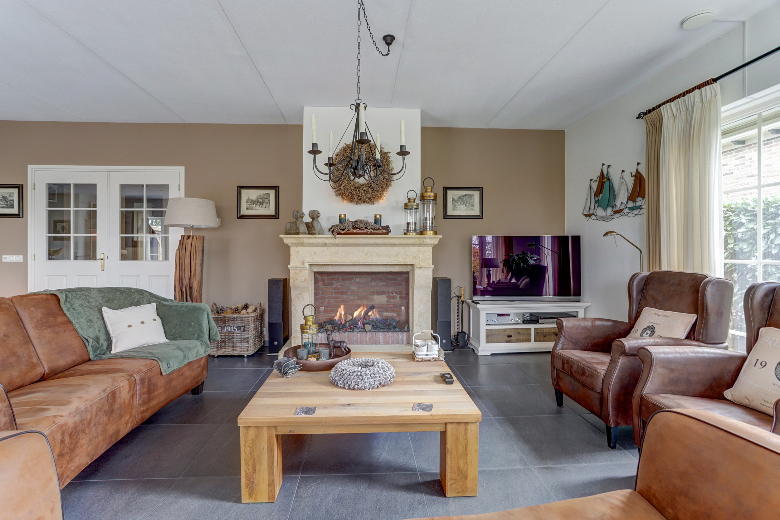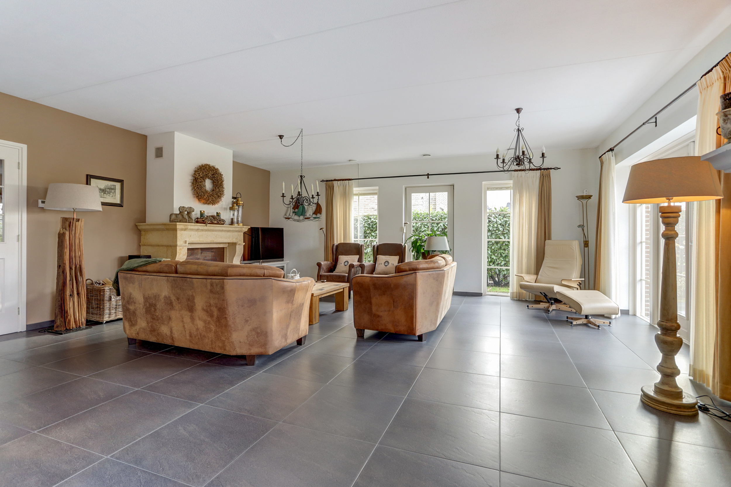 Bij binnenkomst in de ruime entree vind je de meterkast en een toilet. Vanuit de entree heb je toegang tot twee slaapkamers: een ruime kamer met inbouwkasten en een kleinere slaapkamer, evenals een moderne badkamer met dubbele wastafel en meubel, inloopdouche en toilet. Via de entree loop je door de dubbele deuren naar de lichte en zeer riante woonkamer, die dankzij de grote ramen en de haard veel sfeer en licht biedt. Daarnaast is er nog een tweede sfeervolle schouw met haard. De open keuken, voorzien van inbouwapparatuur en een Boretti-gasfornuis met dubbele oven, gaat naadloos over in de bijkeuken met wasmachineaansluiting. Vanuit hier is de aangebouwde garage bereikbaar, waarin de cv-installatie (2025) is geplaatst.