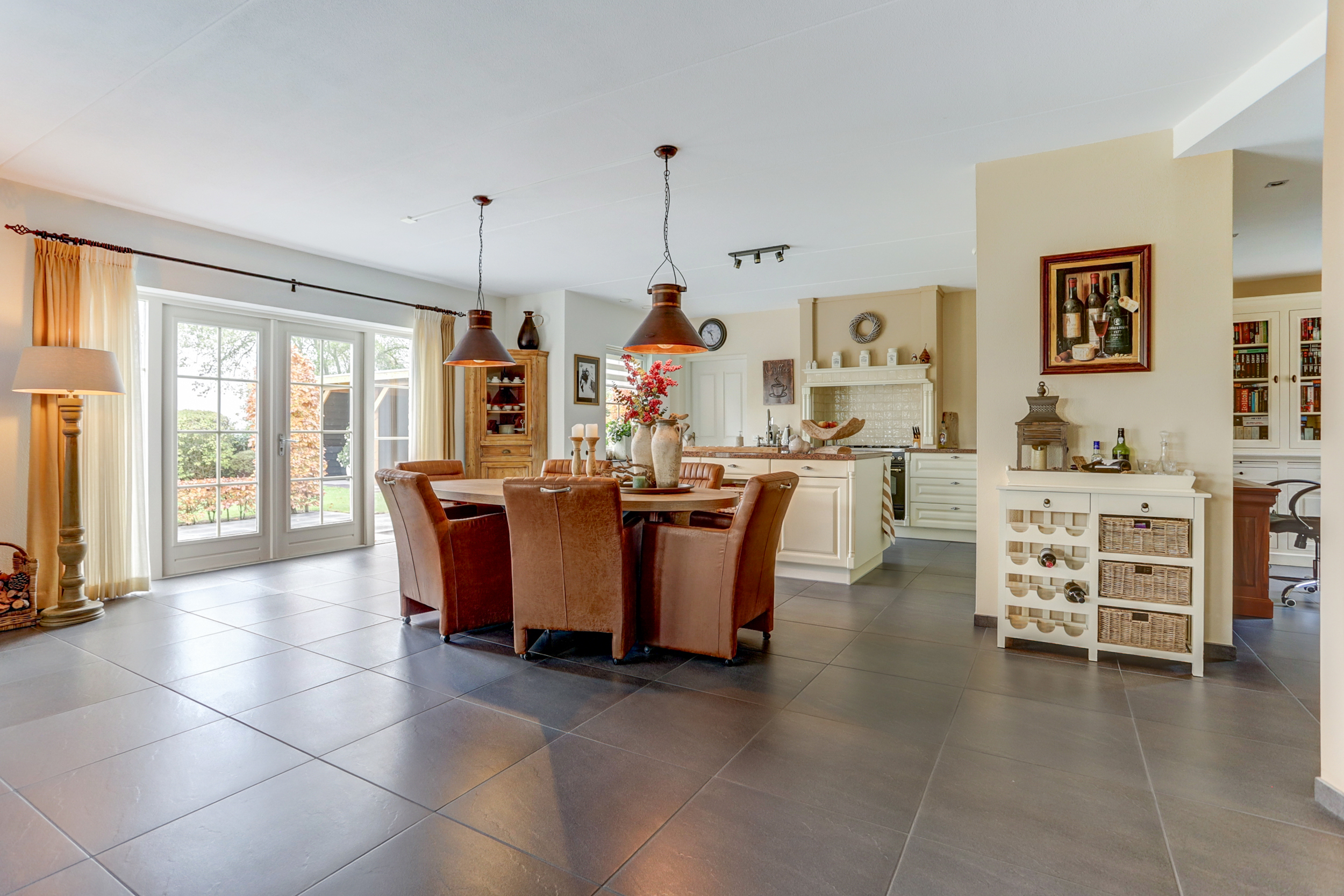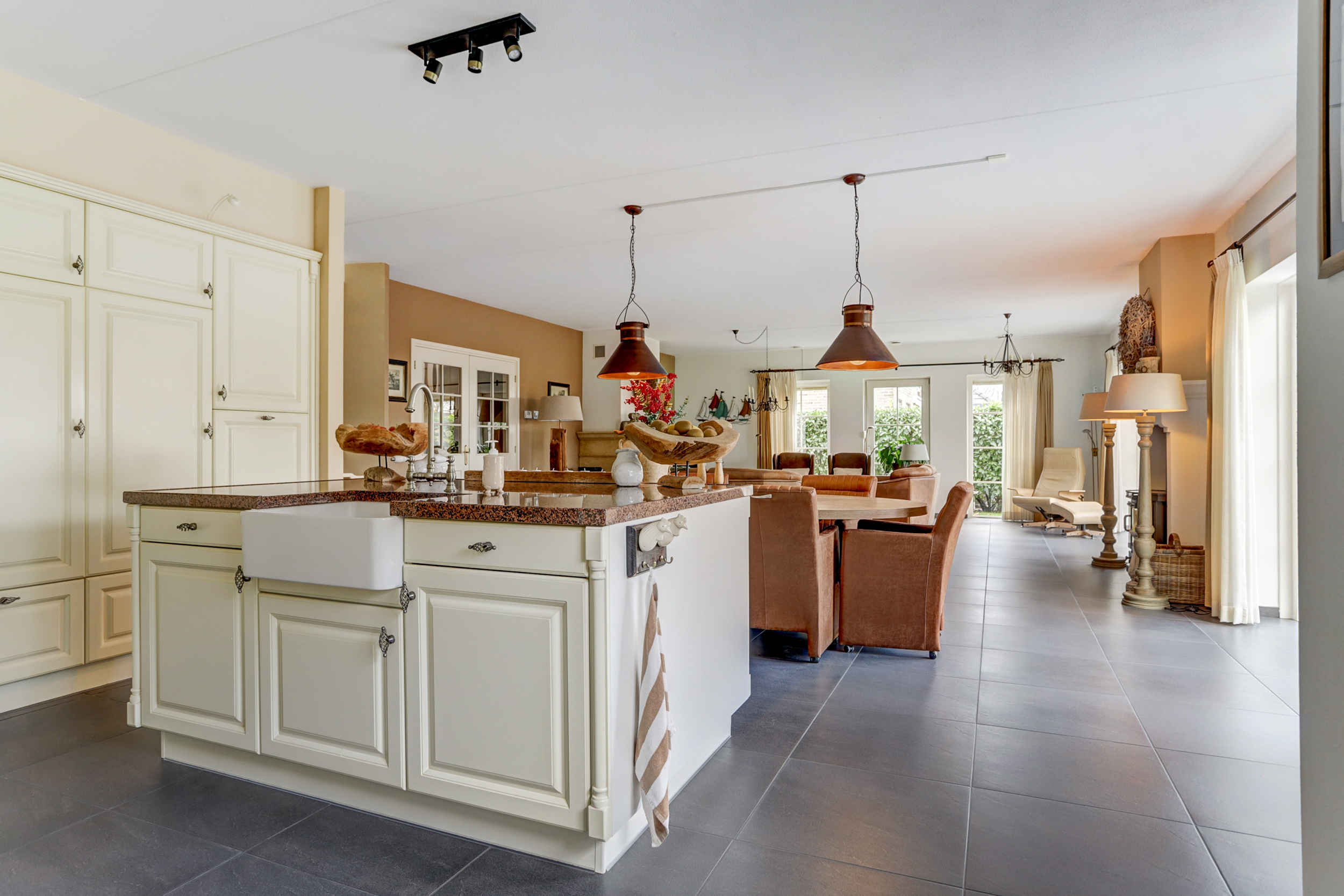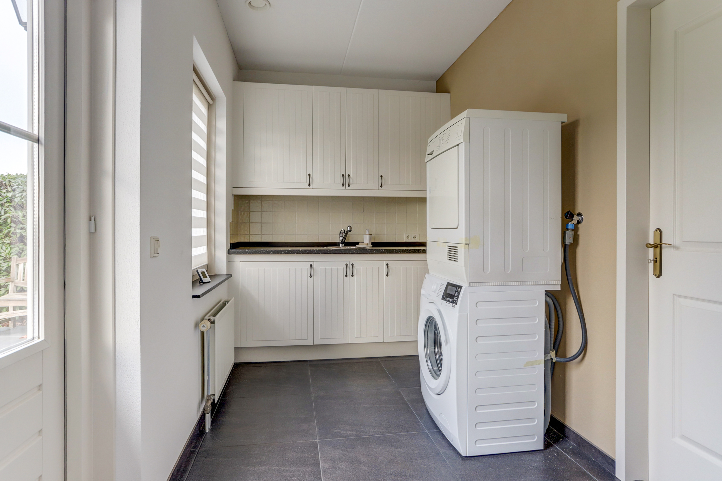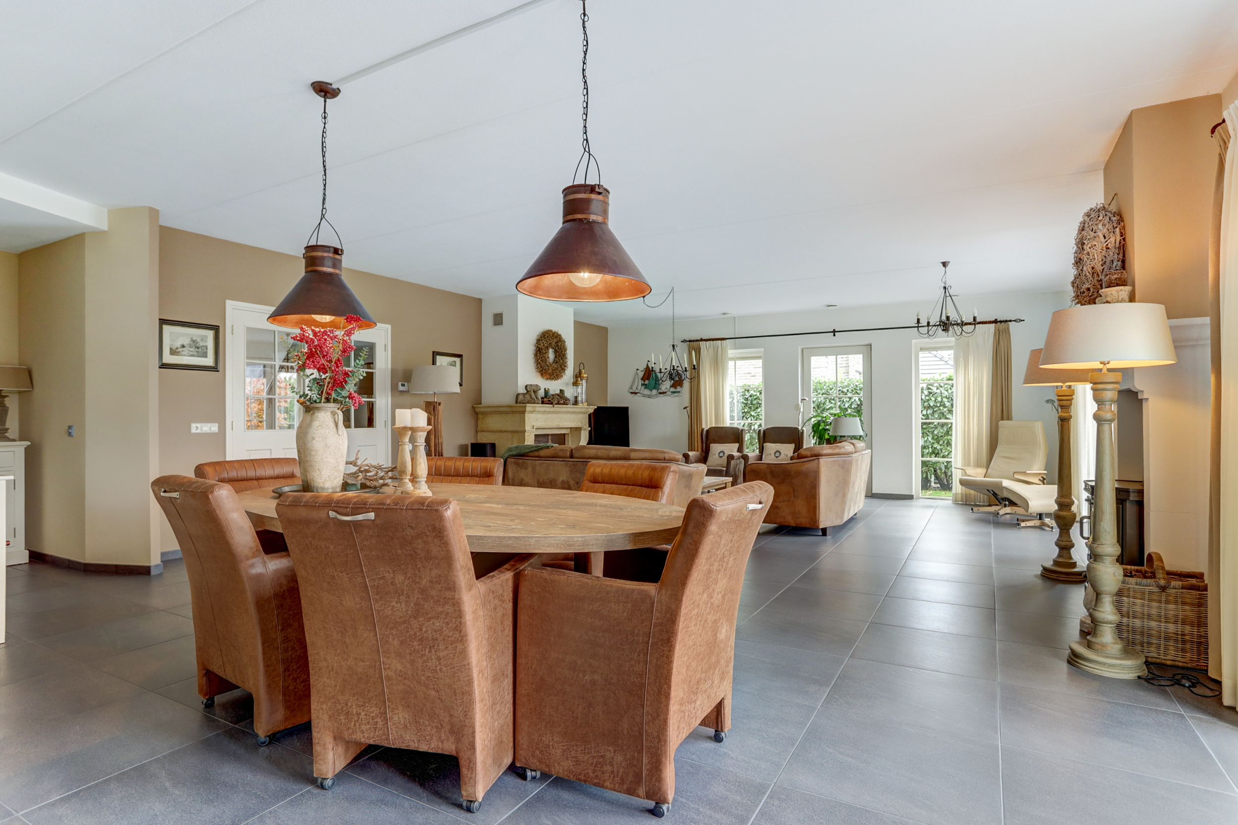 Bij binnenkomst in de ruime entree vind je de meterkast en een toilet. Vanuit de entree heb je toegang tot twee slaapkamers: een ruime kamer met inbouwkasten en een kleinere slaapkamer, evenals een moderne badkamer met dubbele wastafel en meubel, inloopdouche en toilet. Via de entree loop je door de dubbele deuren naar de lichte en zeer riante woonkamer, die dankzij de grote ramen en de haard veel sfeer en licht biedt. Daarnaast is er nog een tweede sfeervolle schouw met haard. De open keuken, voorzien van inbouwapparatuur en een Boretti-gasfornuis met dubbele oven, gaat naadloos over in de bijkeuken met wasmachineaansluiting. Vanuit hier is de aangebouwde garage bereikbaar, waarin de cv-installatie (2025) is geplaatst.