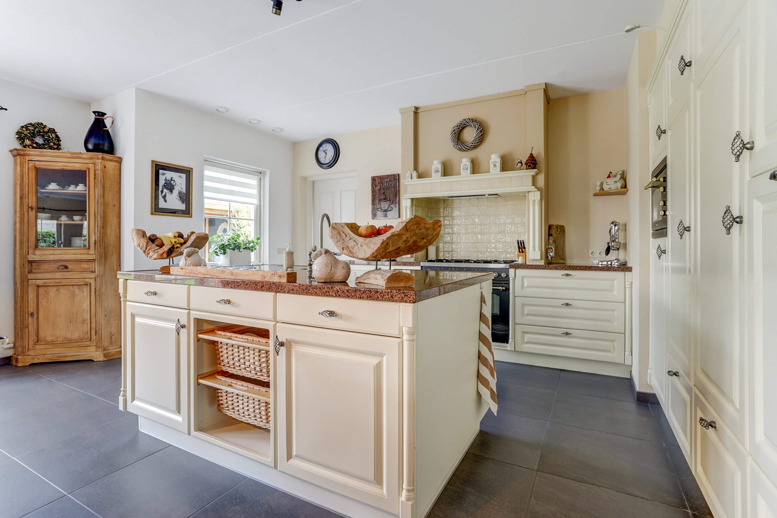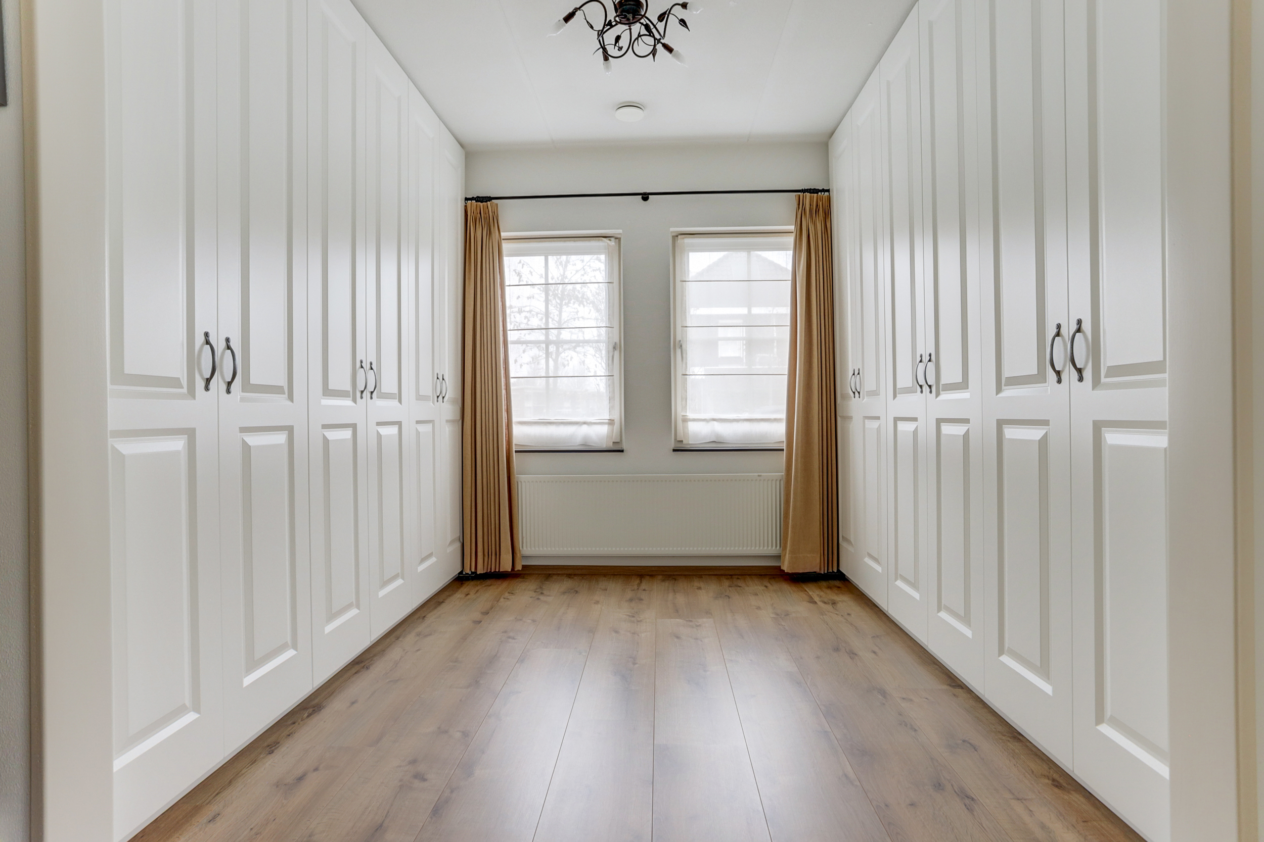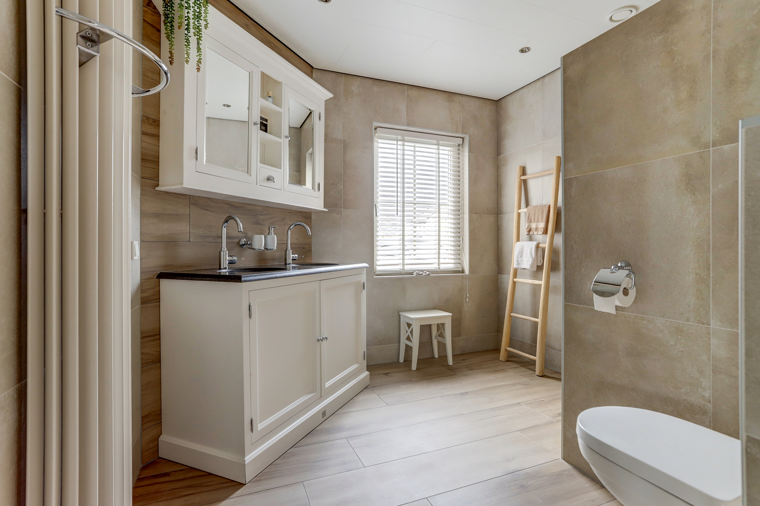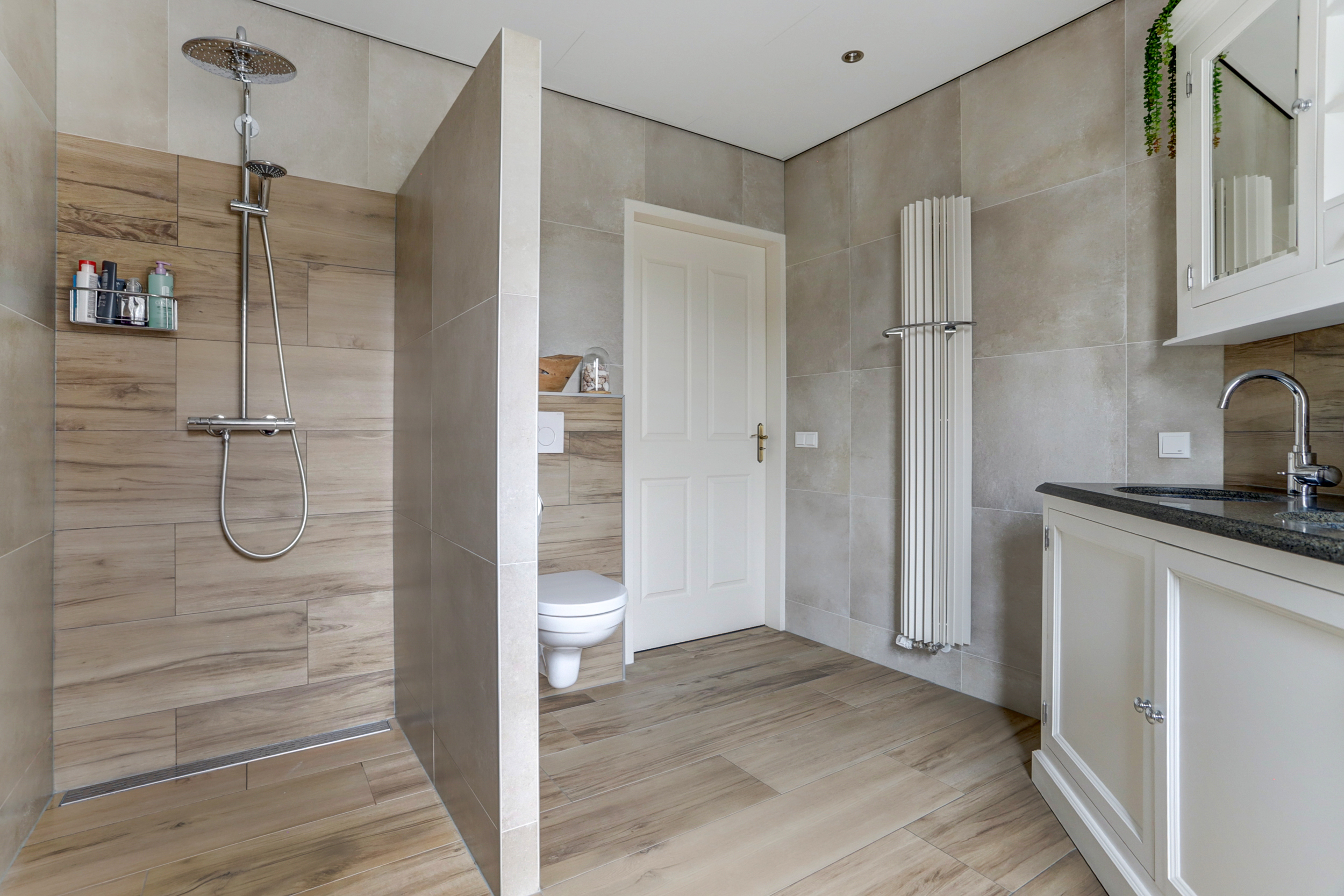 Bij binnenkomst in de ruime entree vind je de meterkast en een toilet. Vanuit de entree heb je toegang tot twee slaapkamers: een ruime kamer met inbouwkasten en een kleinere slaapkamer, evenals een moderne badkamer met dubbele wastafel en meubel, inloopdouche en toilet. Via de entree loop je door de dubbele deuren naar de lichte en zeer riante woonkamer, die dankzij de grote ramen en de haard veel sfeer en licht biedt. Daarnaast is er nog een tweede sfeervolle schouw met haard. De open keuken, voorzien van inbouwapparatuur en een Boretti-gasfornuis met dubbele oven, gaat naadloos over in de bijkeuken met wasmachineaansluiting. Vanuit hier is de aangebouwde garage bereikbaar, waarin de cv-installatie (2025) is geplaatst.