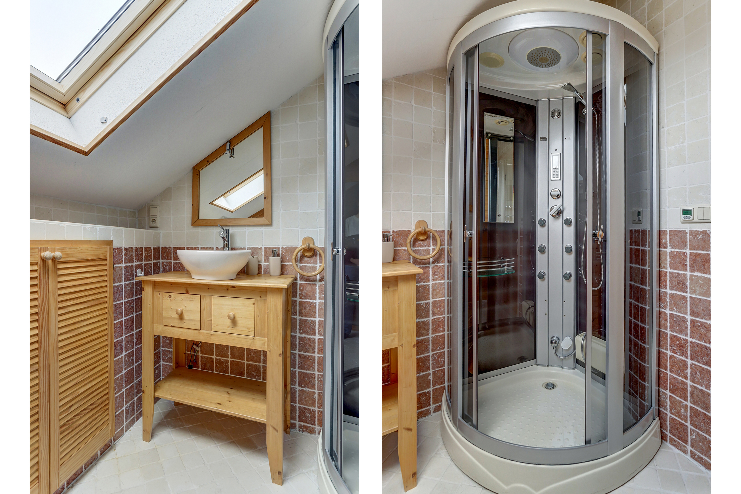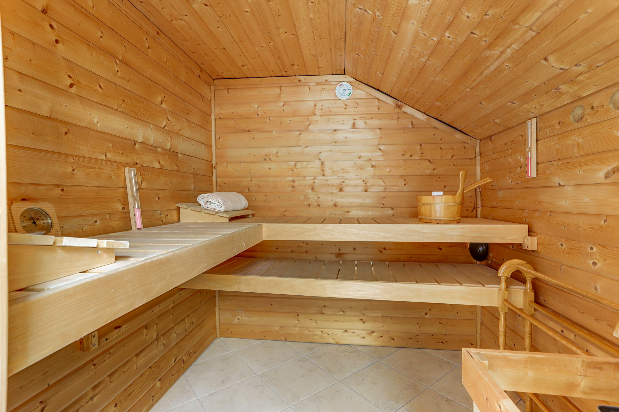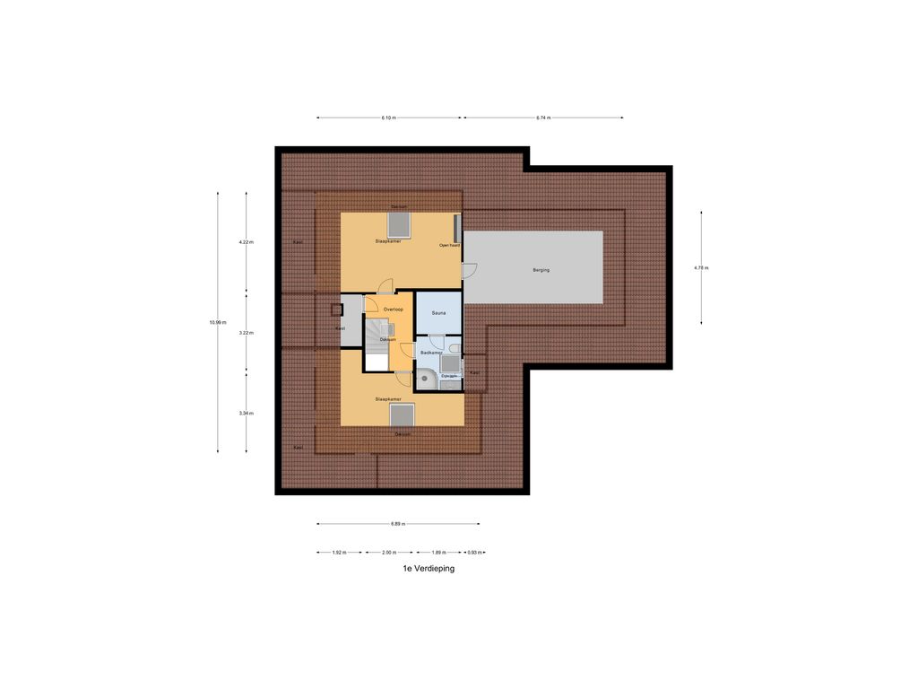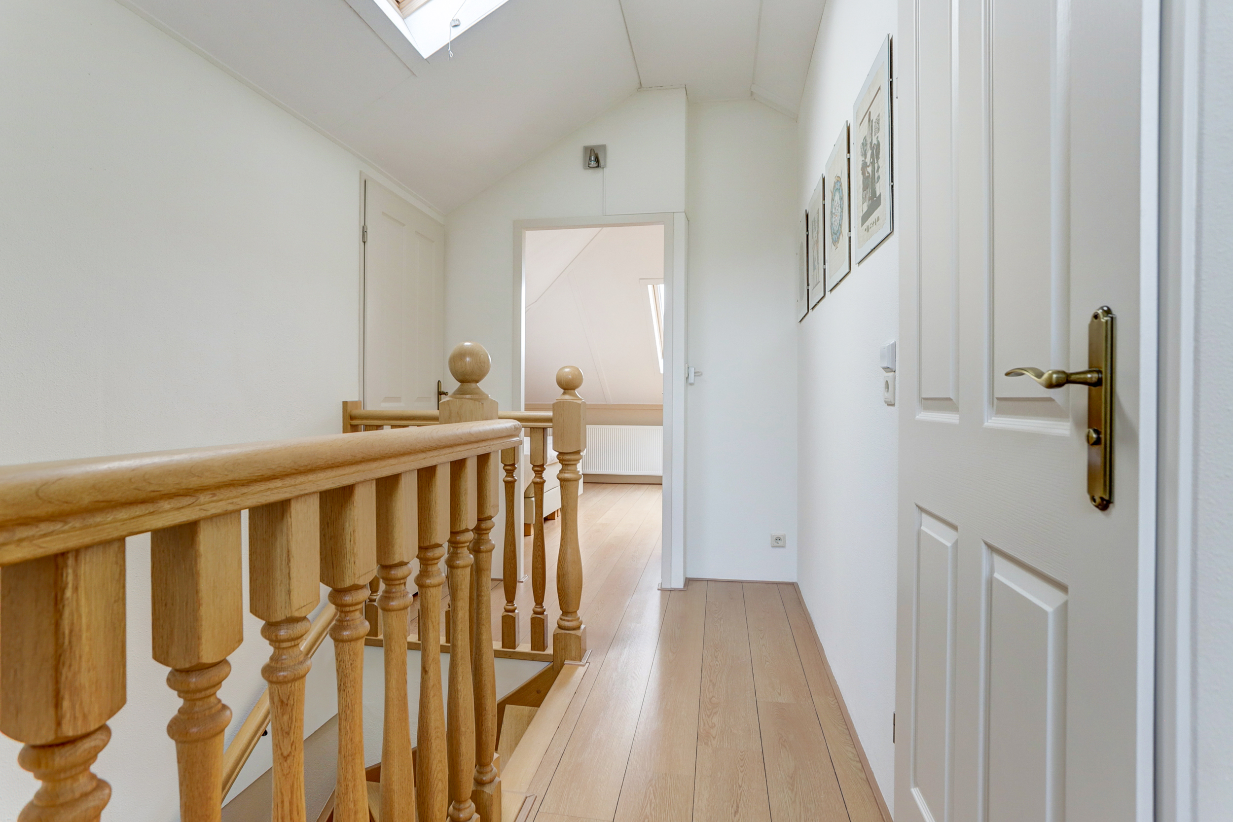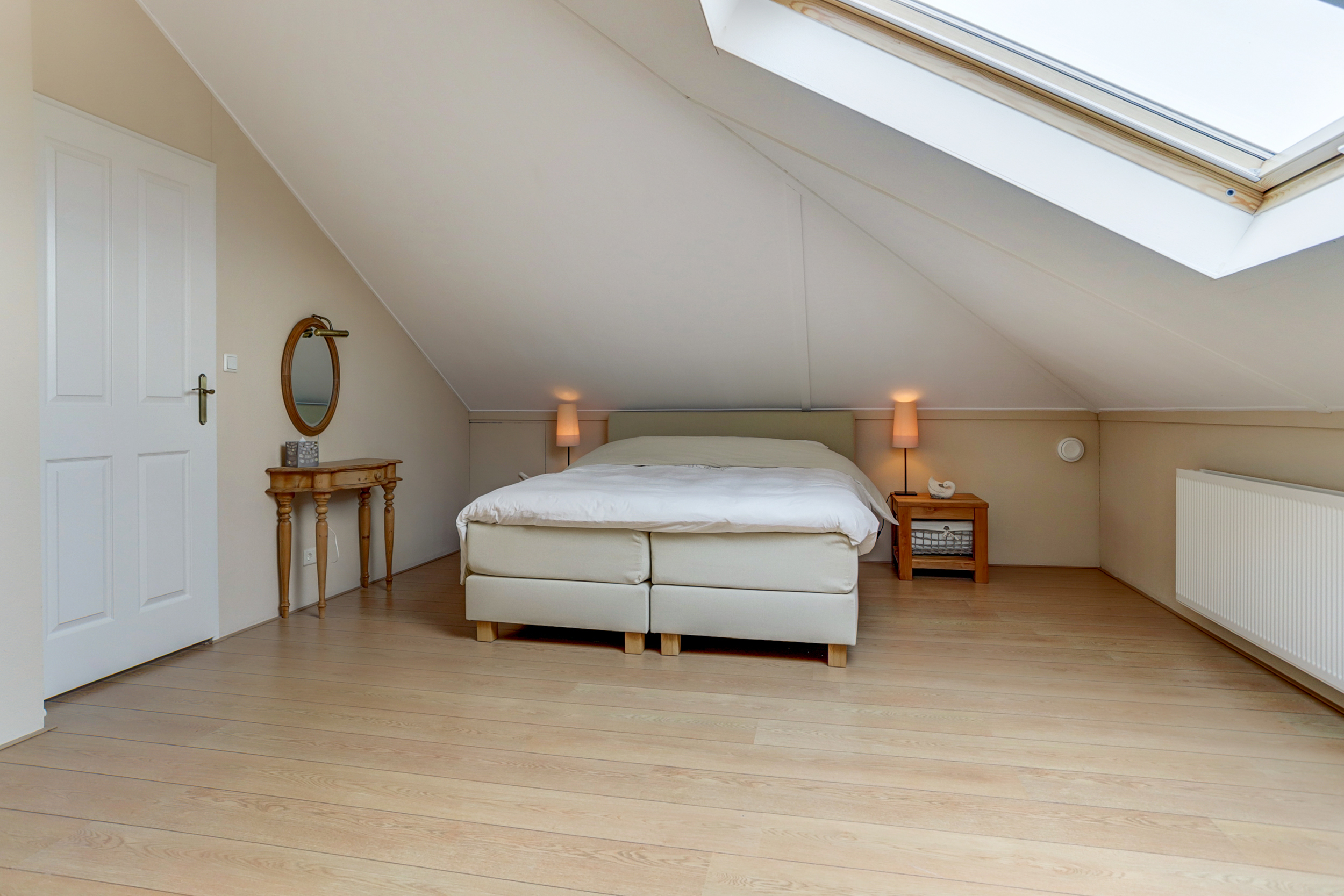 Via de vaste trap in de entree kom je op de eerste verdieping. De overloop met dakraam geeft toegang tot twee ruime slaapkamers. De badkamer op deze verdieping is uitgerust met een douche, wastafel, toilet en zelfs een sauna. Bovendien is er nog een extra ruimte op deze verdieping, ideaal als opslag of als extra kamer.