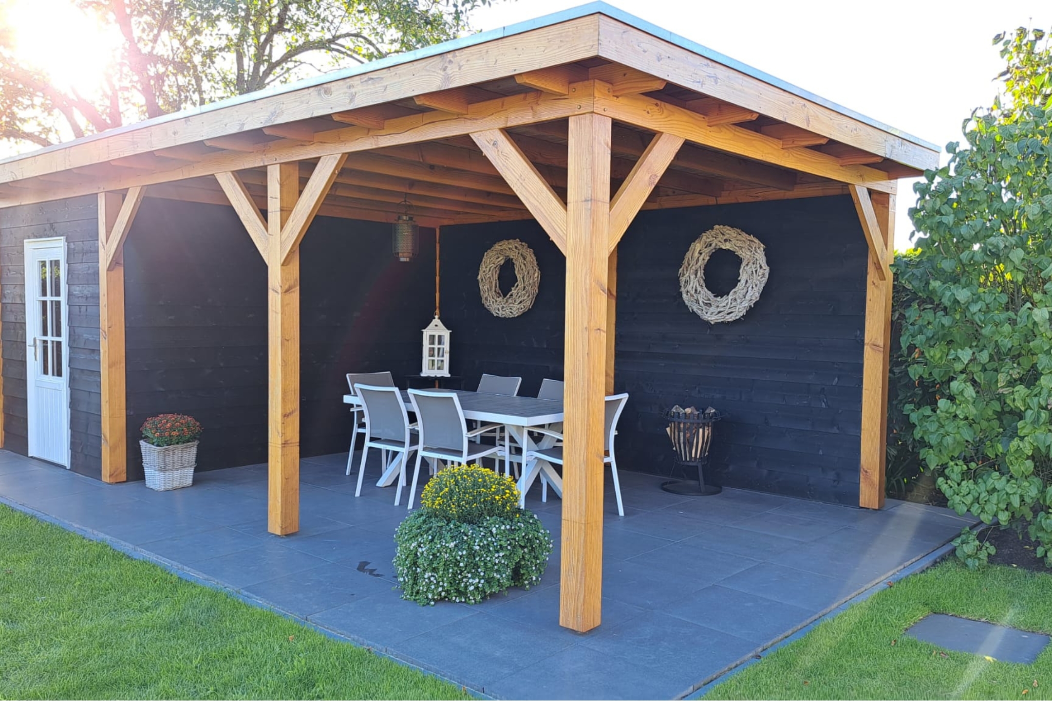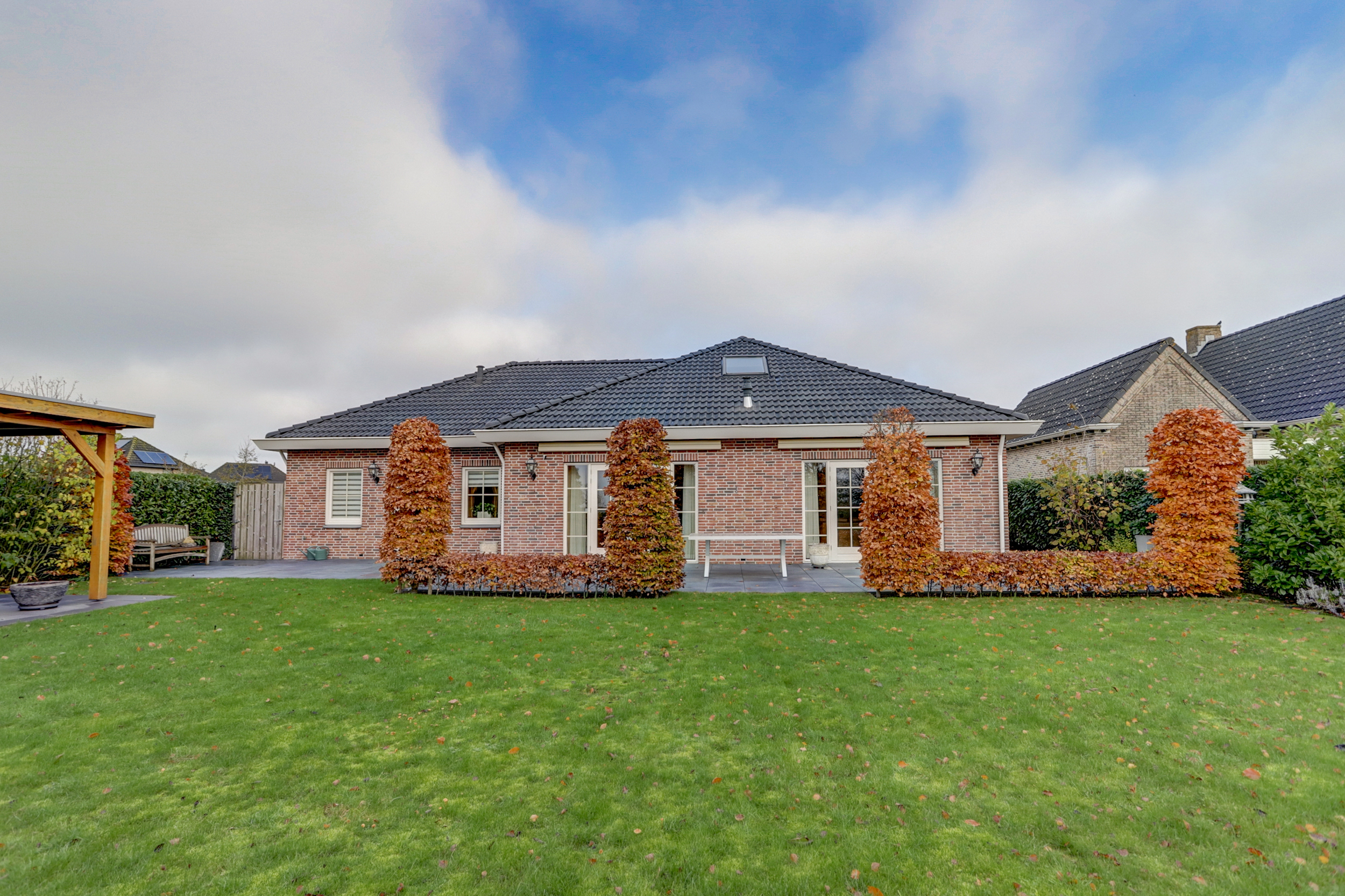 De rondom gelegen tuin ligt op het zuidwesten en biedt volop privacy. De ruime oprit maakt parkeren op eigen terrein eenvoudig. De aangebouwde garage is voorzien van een elektrische roldeur en zijdeur. In de achtertuin bevindt zich een gezellige overkapping met berging, die in 2021 is geplaatst. Openslaande deuren in de woonkamer verbinden binnen en buiten op een prettige manier, waardoor je optimaal van de tuin kunt genieten.