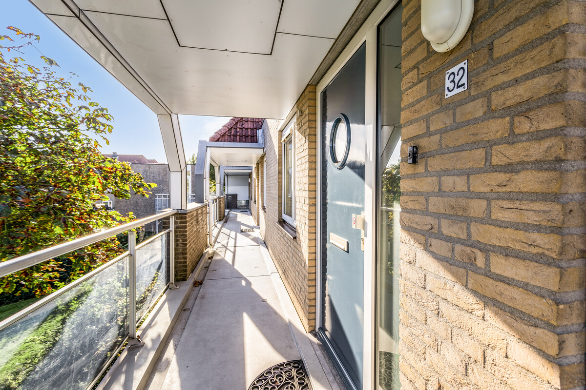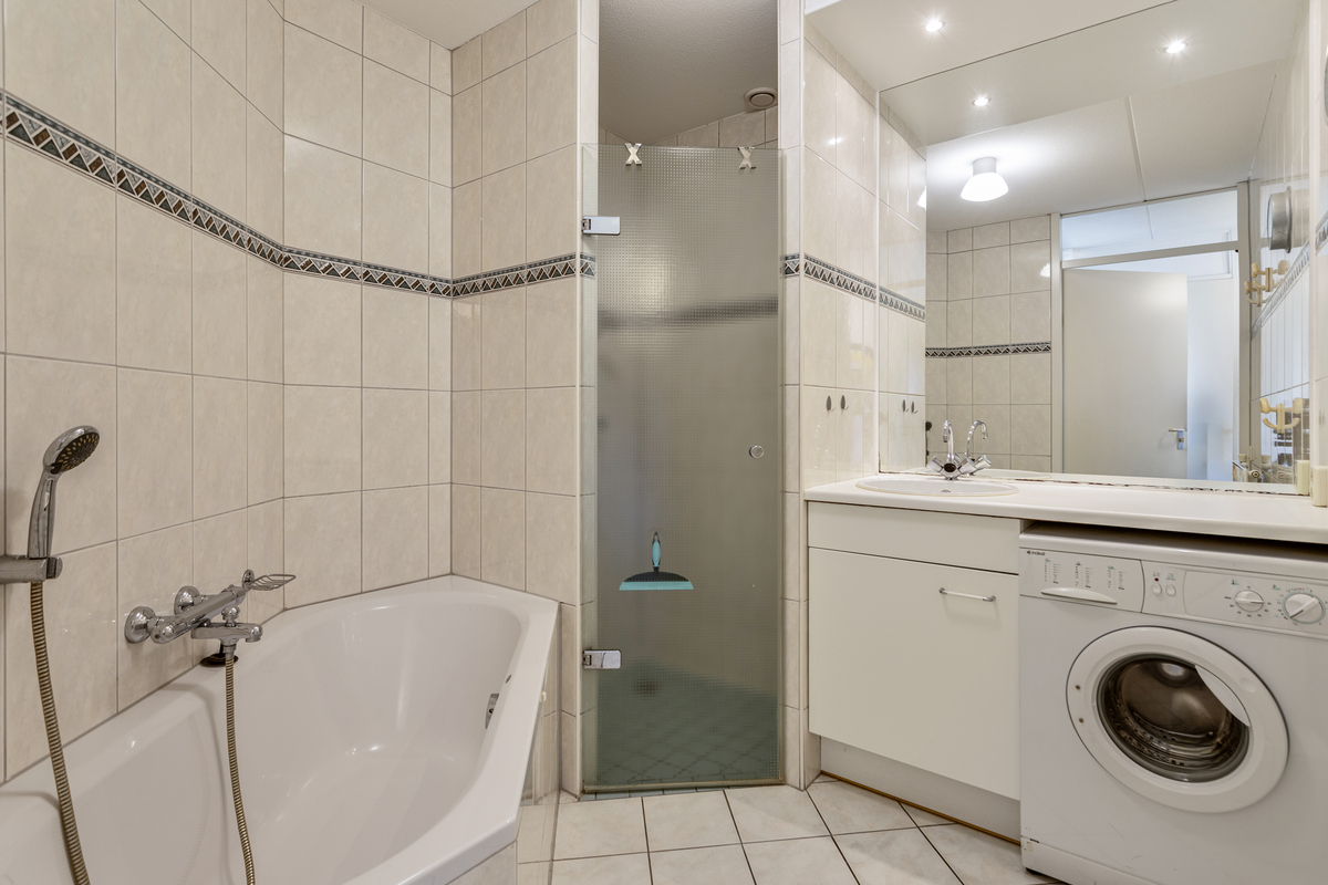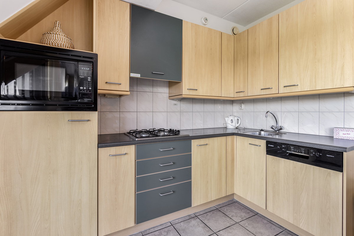 Entree met meterkast geeft toegang tot de 2 slaapkamers gelegen aan de voorzijde van het appartement. Een toilet met fonteintje, kast met opstelling van de CV-ketel zit allemaal in de hal. Badkamer met wastafelmeubel, inloopdouche en ligbad. Vanuit de entree kom je binnen in de lichte woonkamer met openslaande deuren naar het balkon. Open keuken voorzien van inbouwapparatuur.