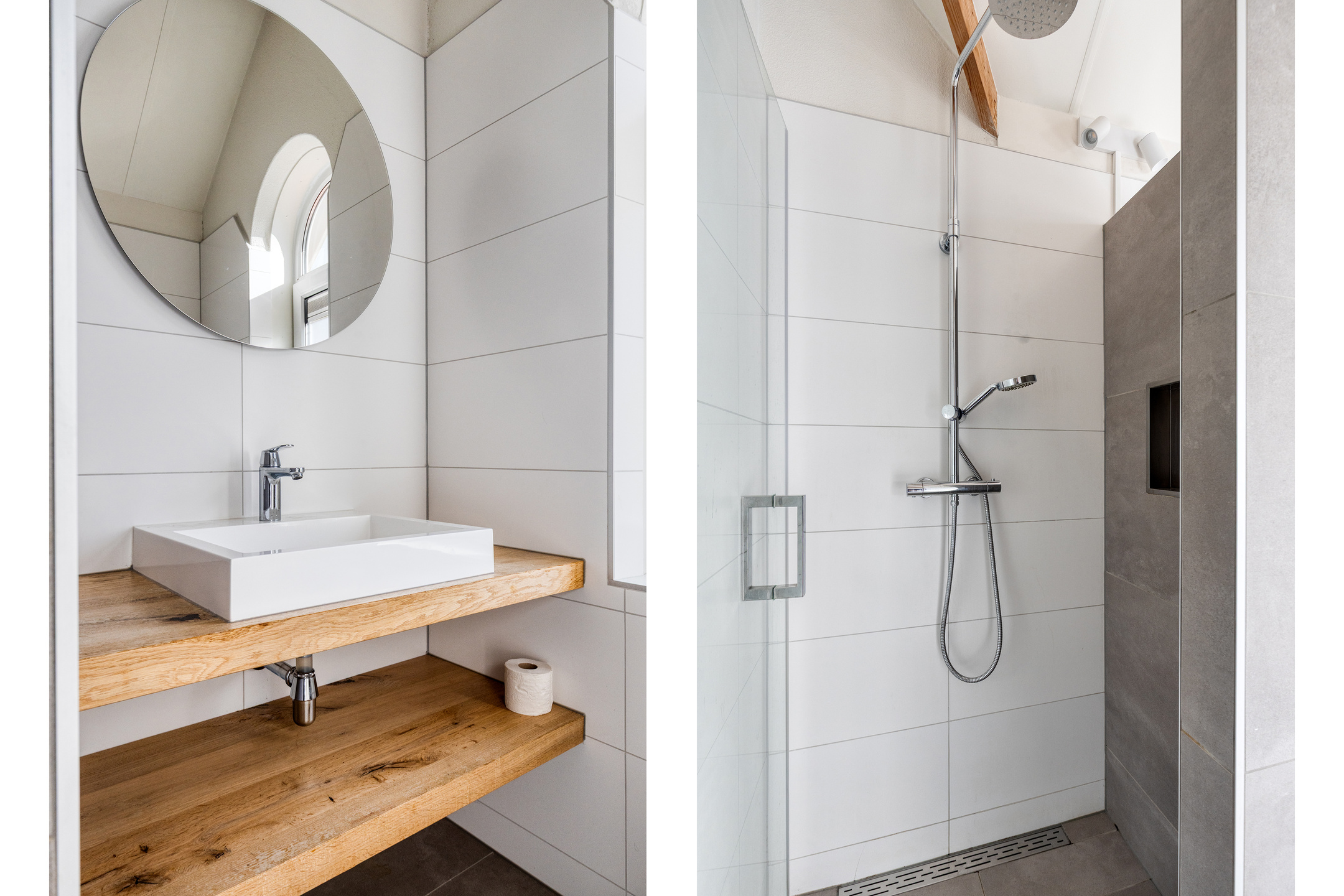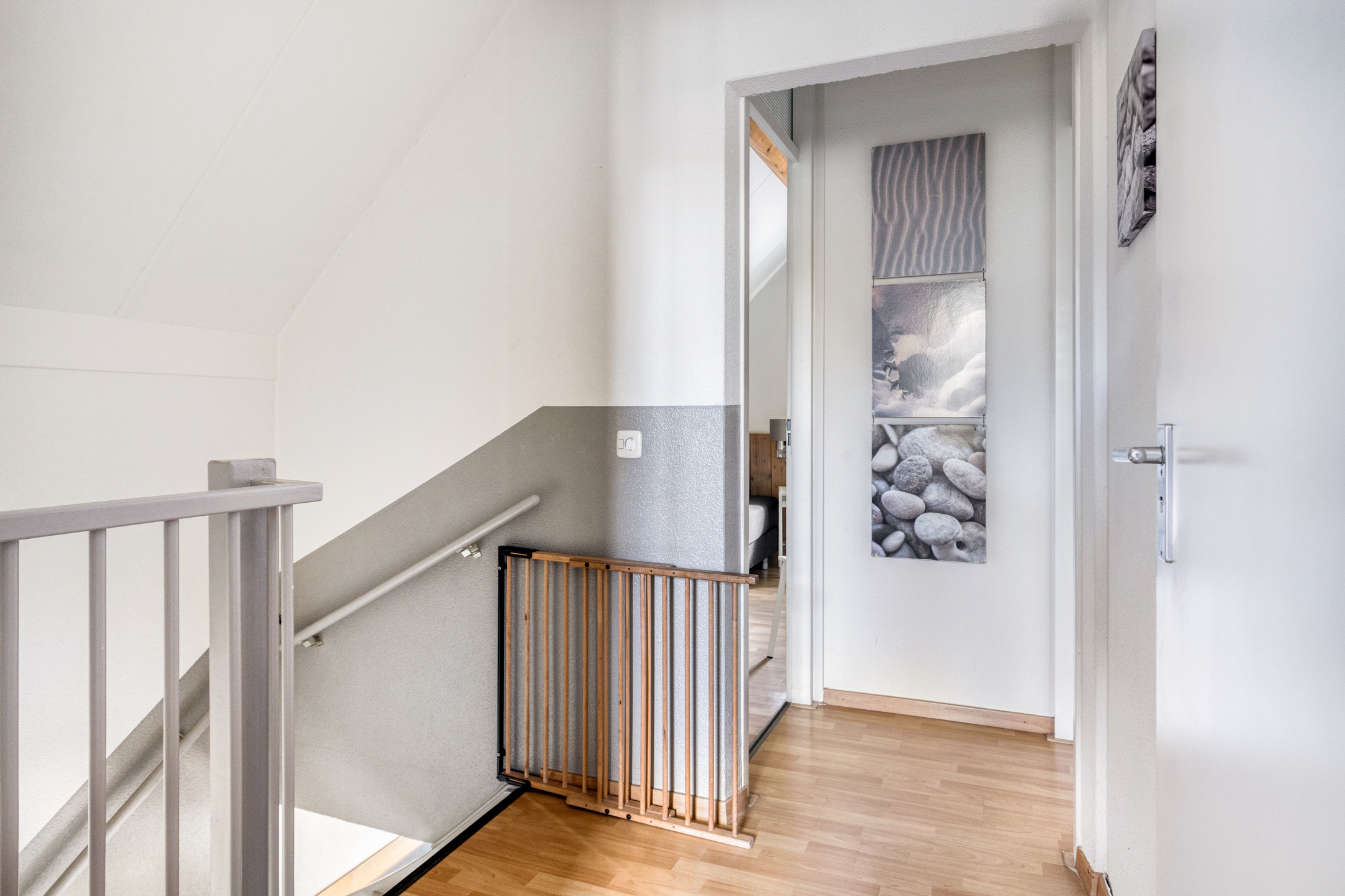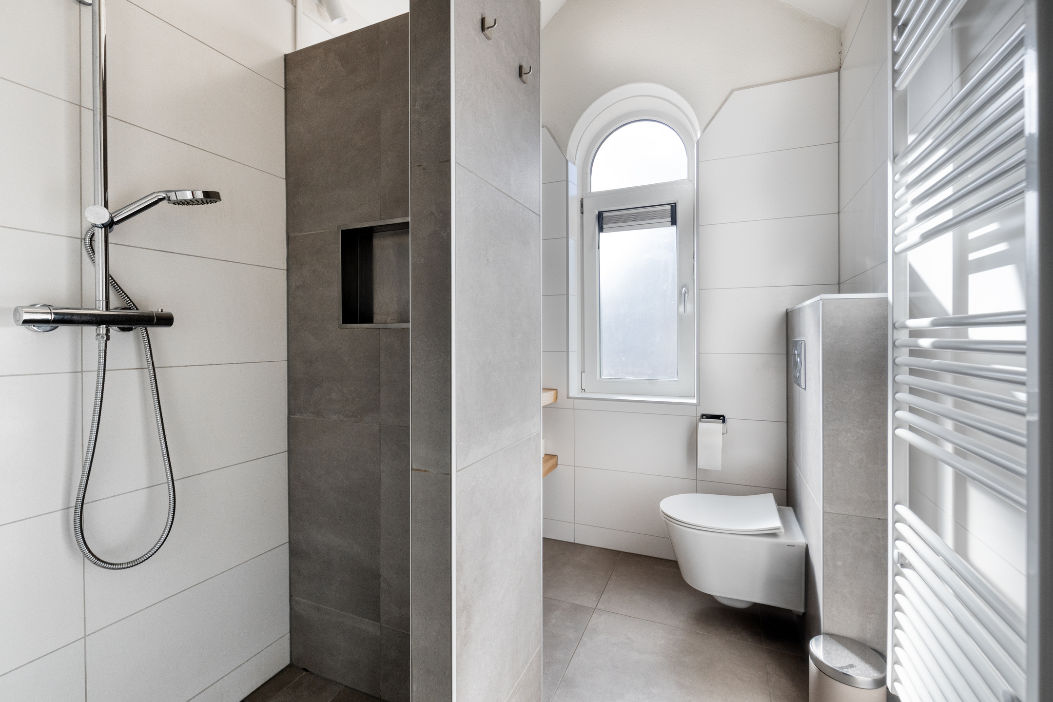 De trapopgang bevindt zich in de woonkamer en leidt naar de eerste verdieping met een overloop die toegang biedt tot drie slaapkamers en de badkamer. De badkamer is voorzien van een moderne inloopdouche, een stijlvol wastafelmeubel en een toilet.
