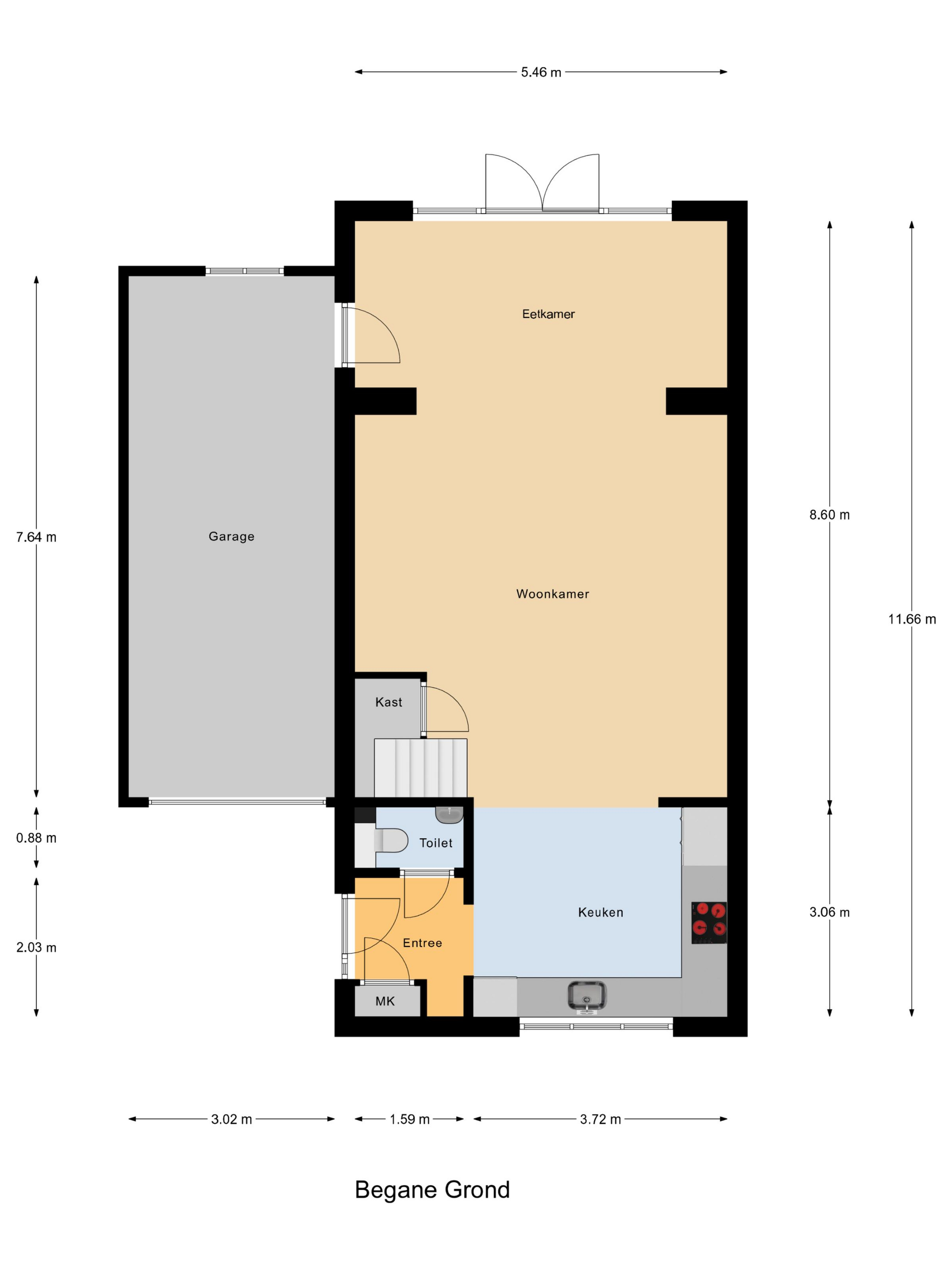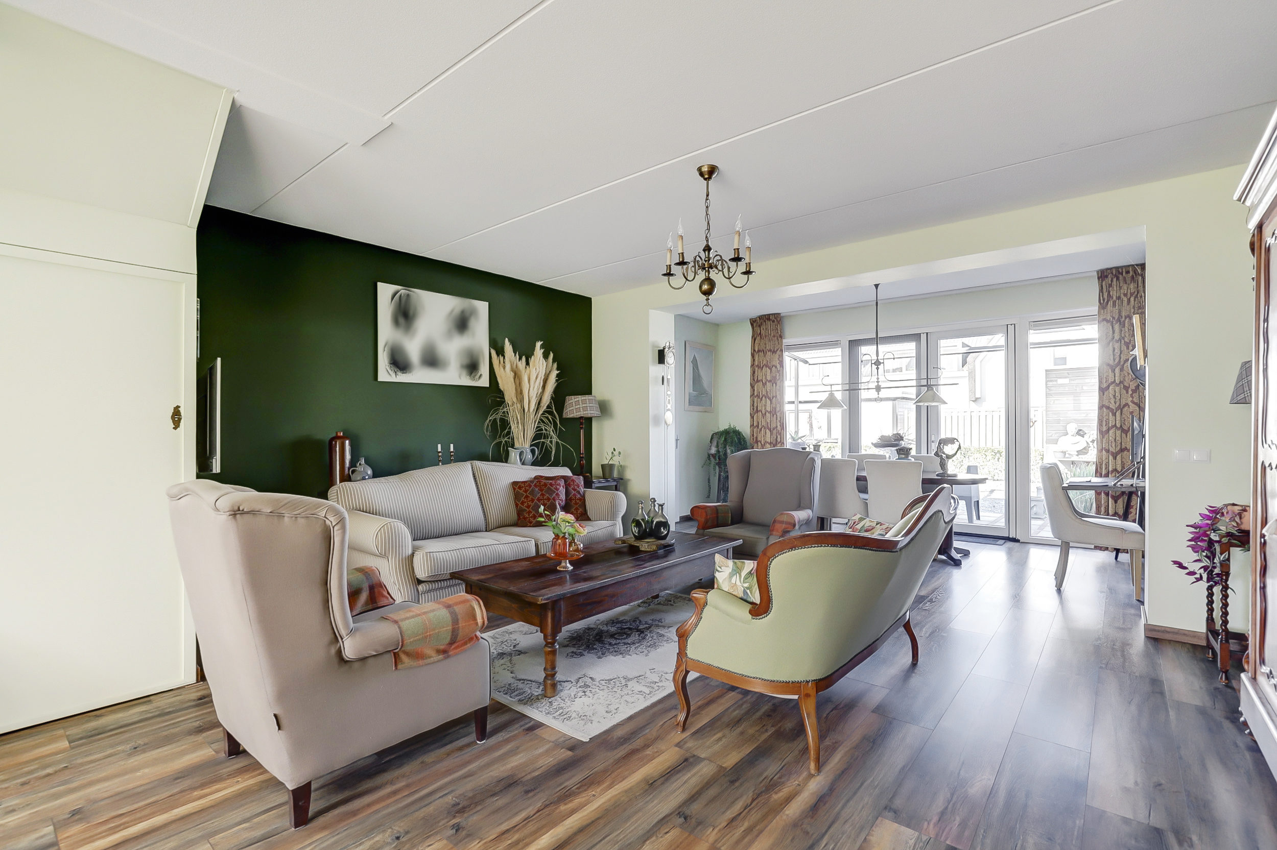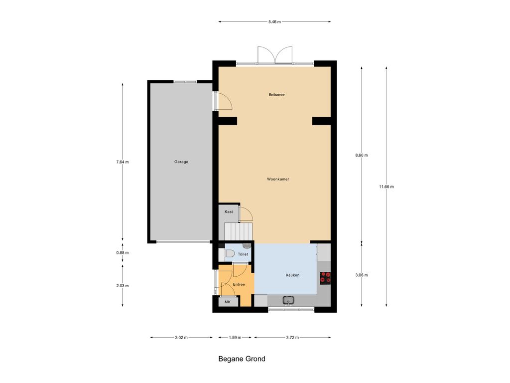 Entree via de hal met toegang tot het toilet met wastafel, de meterkast en de woonkamer. De lichte uitgebouwde woonkamer met open keuken is praktisch ingericht. De keuken is voorzien van moderne inbouwapparatuur. In de woonkamer is nog een kast aanwezig voor extra opbergruimte. De openslaande deuren in de woonkamer geven je mooi uitzicht op de groene achtertuin. Aan de achterzijde is een heerlijke overkapping gemaakt, die het woongevoel vergroot.