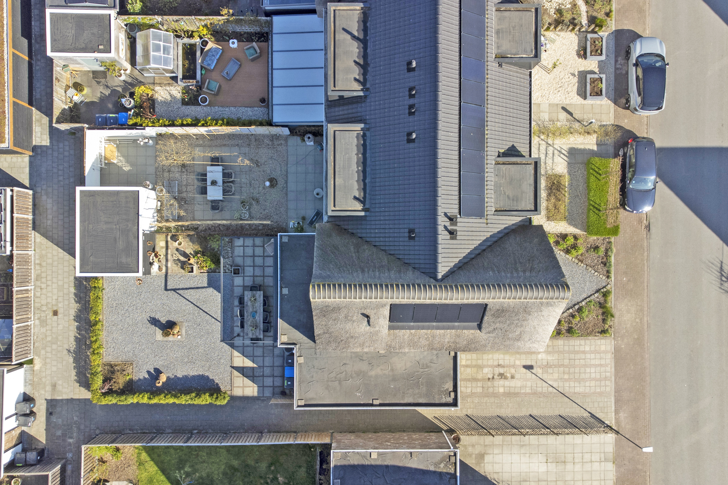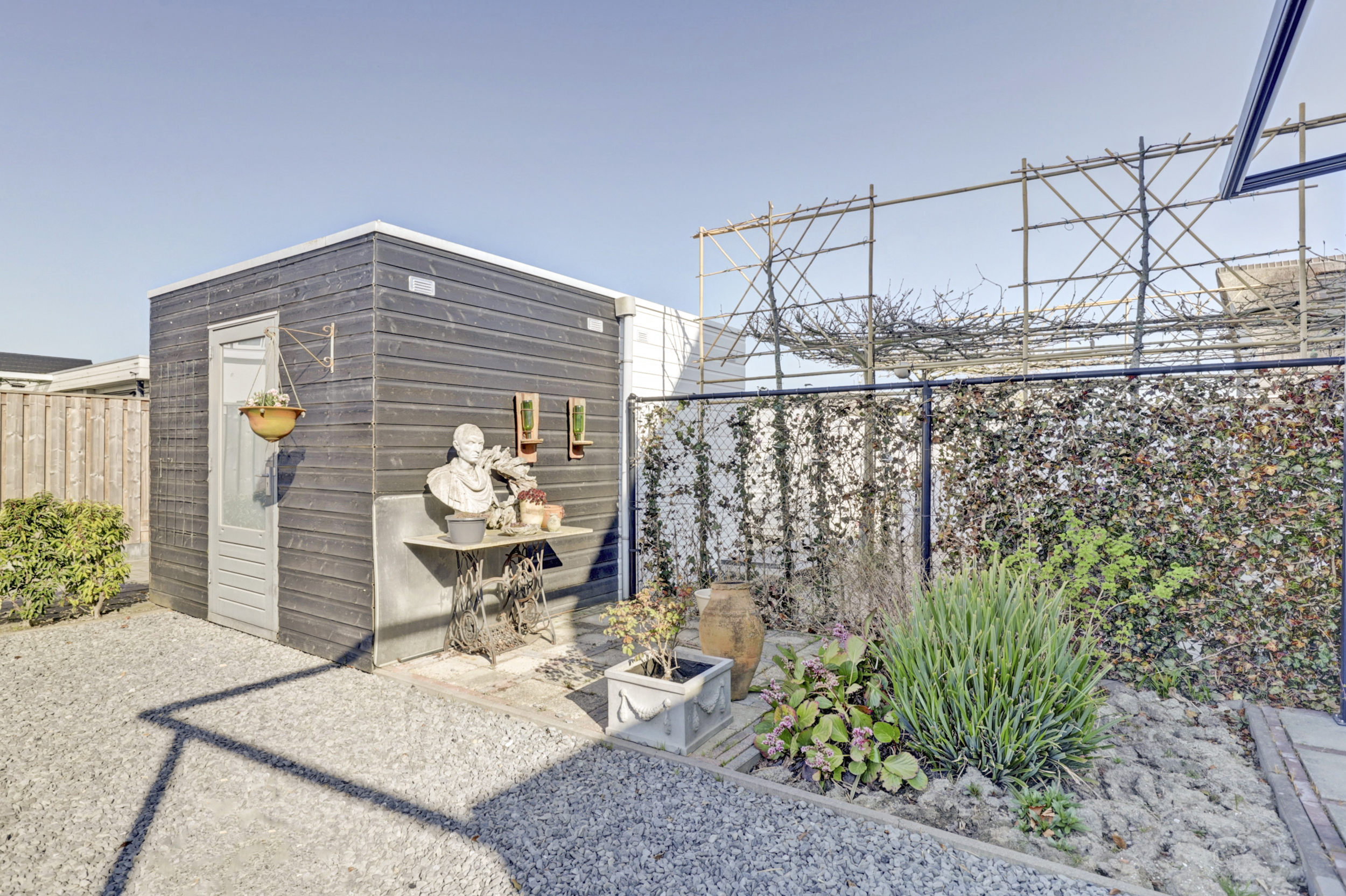 De achtertuin ligt op het westen en biedt veel privacy. Hier is ook de houten berging gesitueerd. Parkeren is mogelijk aan de voorzijde van de woning. De aangebouwde garage is voorzien van elektra en heeft een elektrische roldeur.