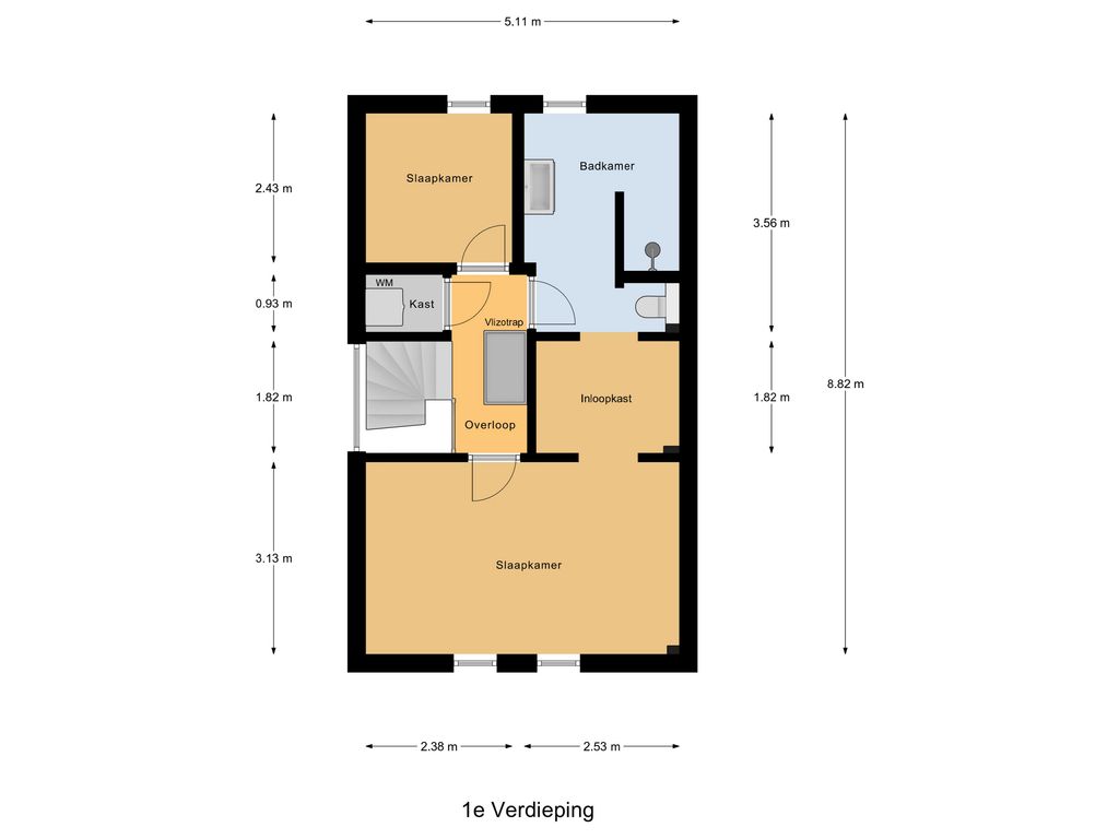 Via de trap in de woonkamer bereik je de eerste verdieping. Op de eerste verdieping bevinden twee slaapkamers, de badkamer, een extra ruimte voor eventueel een werk/kantoorruimte en nog een extra berghok. Aan de voorzijde van de woning is de grootste slaapkamer gesitueerd, van hieruit bereik je de inloopkast en de badkamer. De moderne badkamer is voorzien van een toilet, een inloopdouche en een wastafelmeubel. De badkamer is zowel vanuit de overloop als vanuit de extra ruimte te bereiken. Er is nog een aparte inpandige bergruimte aanwezig, hier is onder andere de wasmachine aansluiting.