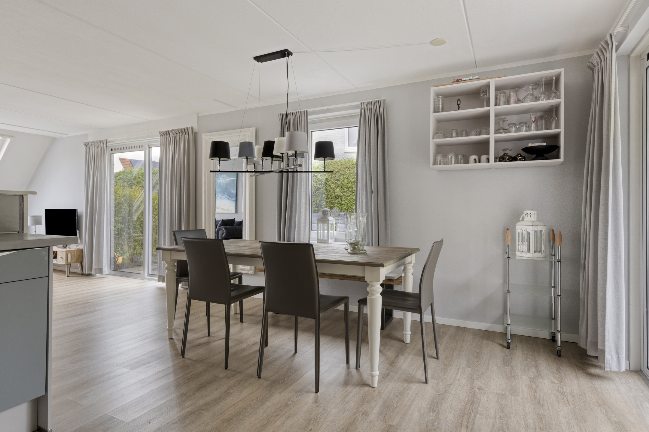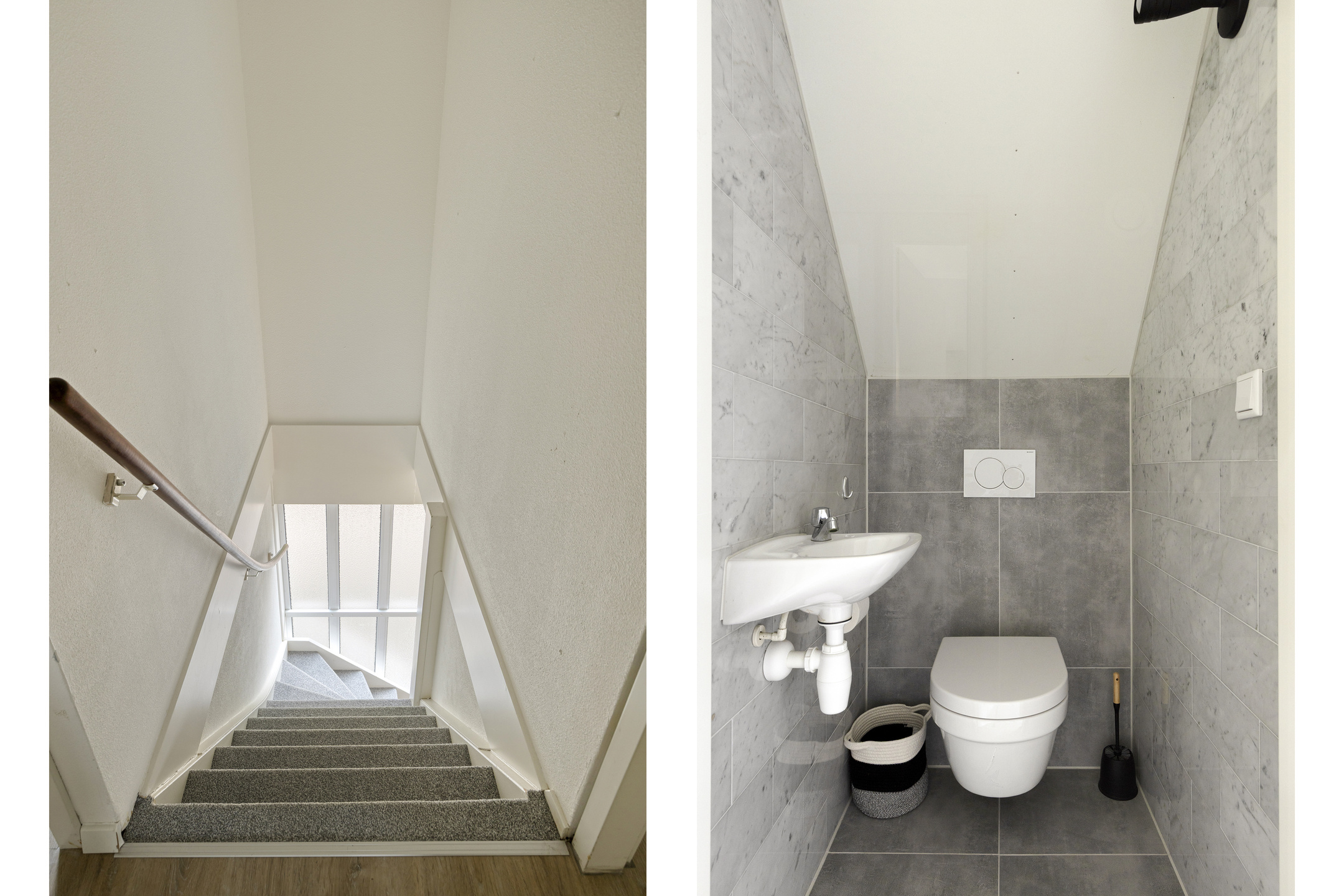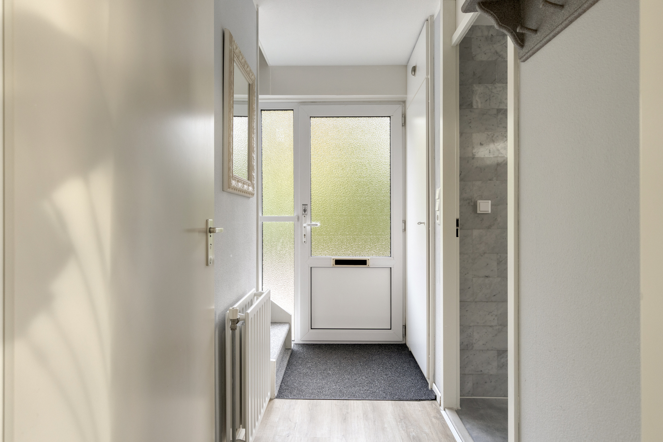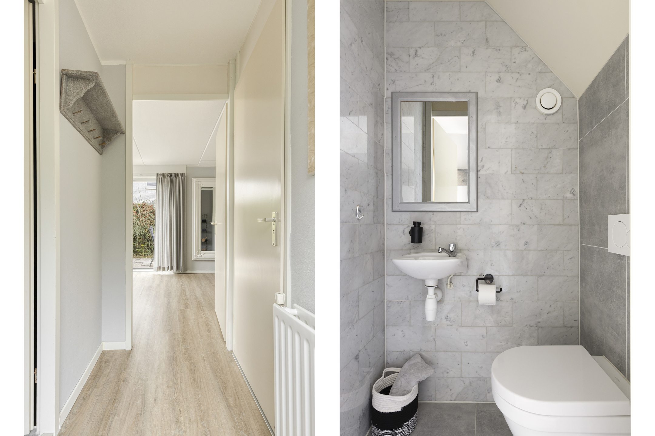 Via de zijkant van de woning bereik je via de voordeur de entree, van waaruit je toegang hebt tot de moderne badkamer, apart toilet en de woonkamer. De lichte woonkamer loopt over in de eetkamer met aansluitend de open keuken. Vanuit de woonkamer en eetkamer bereik je via een schuifpui de achtertuin met overkapping. Vanuit de keuken en via buiten is er nog toegang tot de inpandige berging met witgoedaansluiting en de cv-ketel.