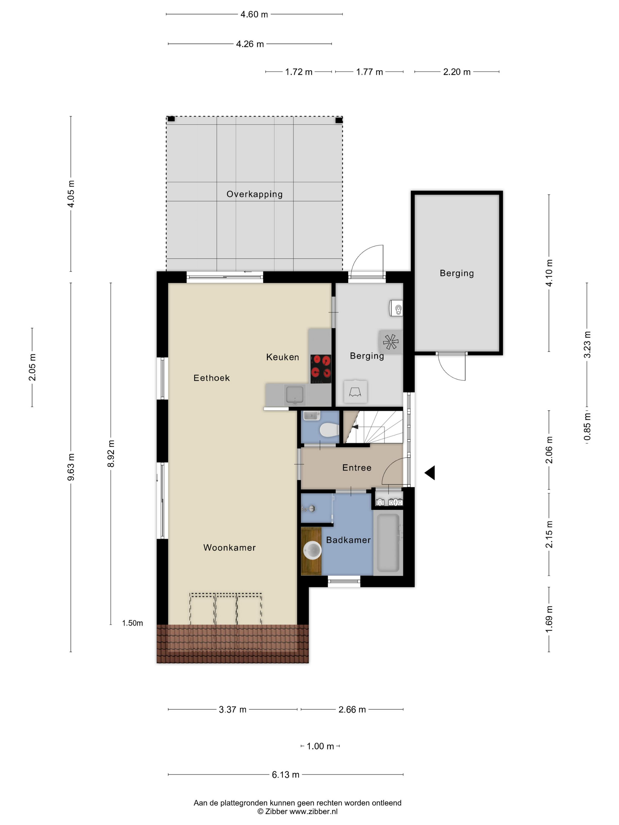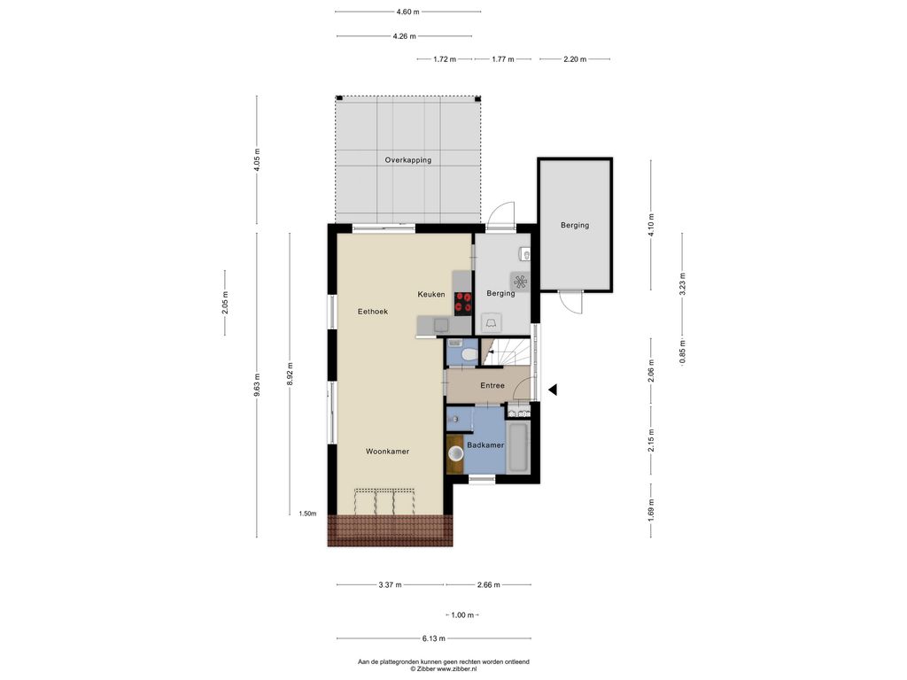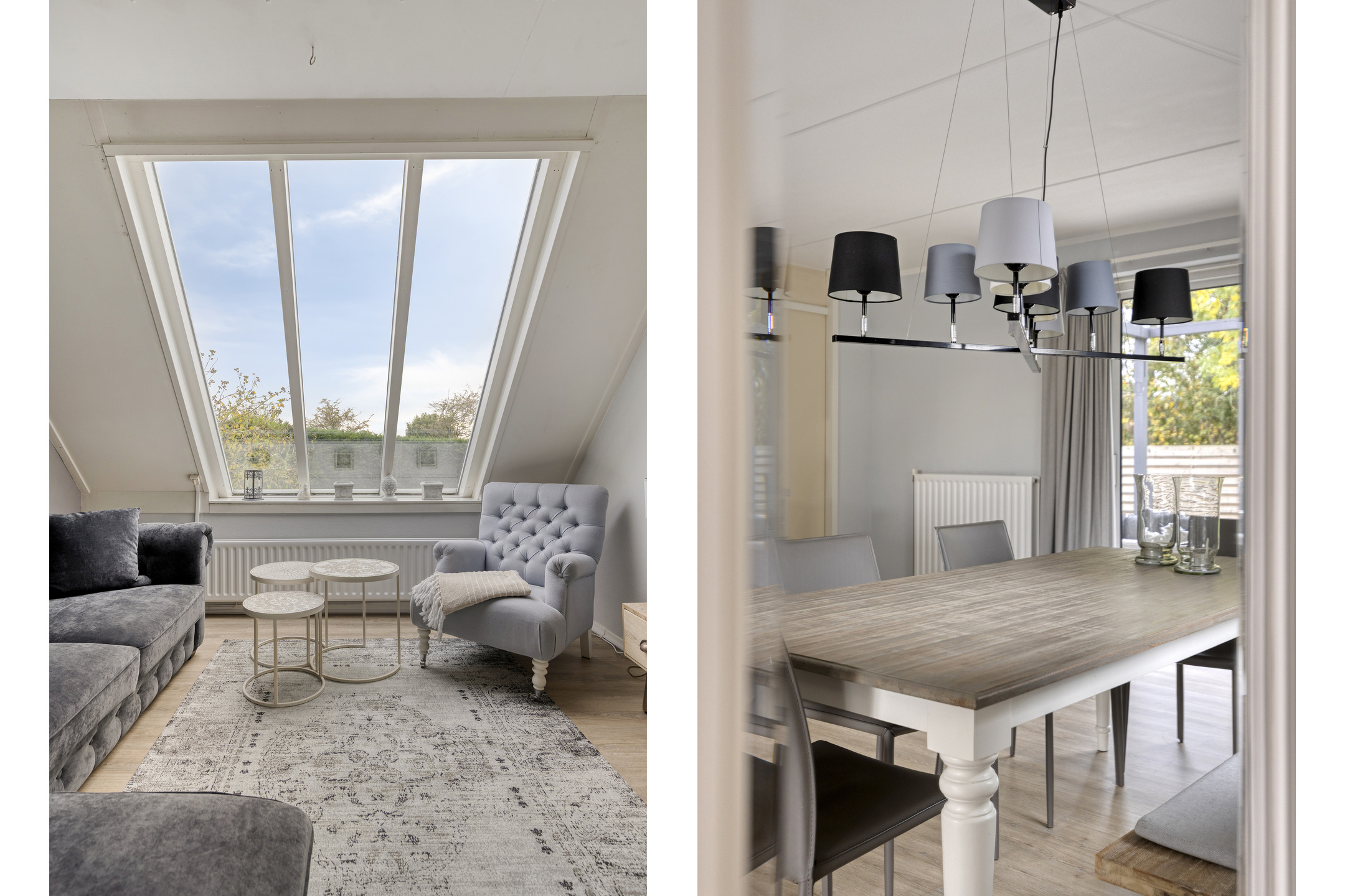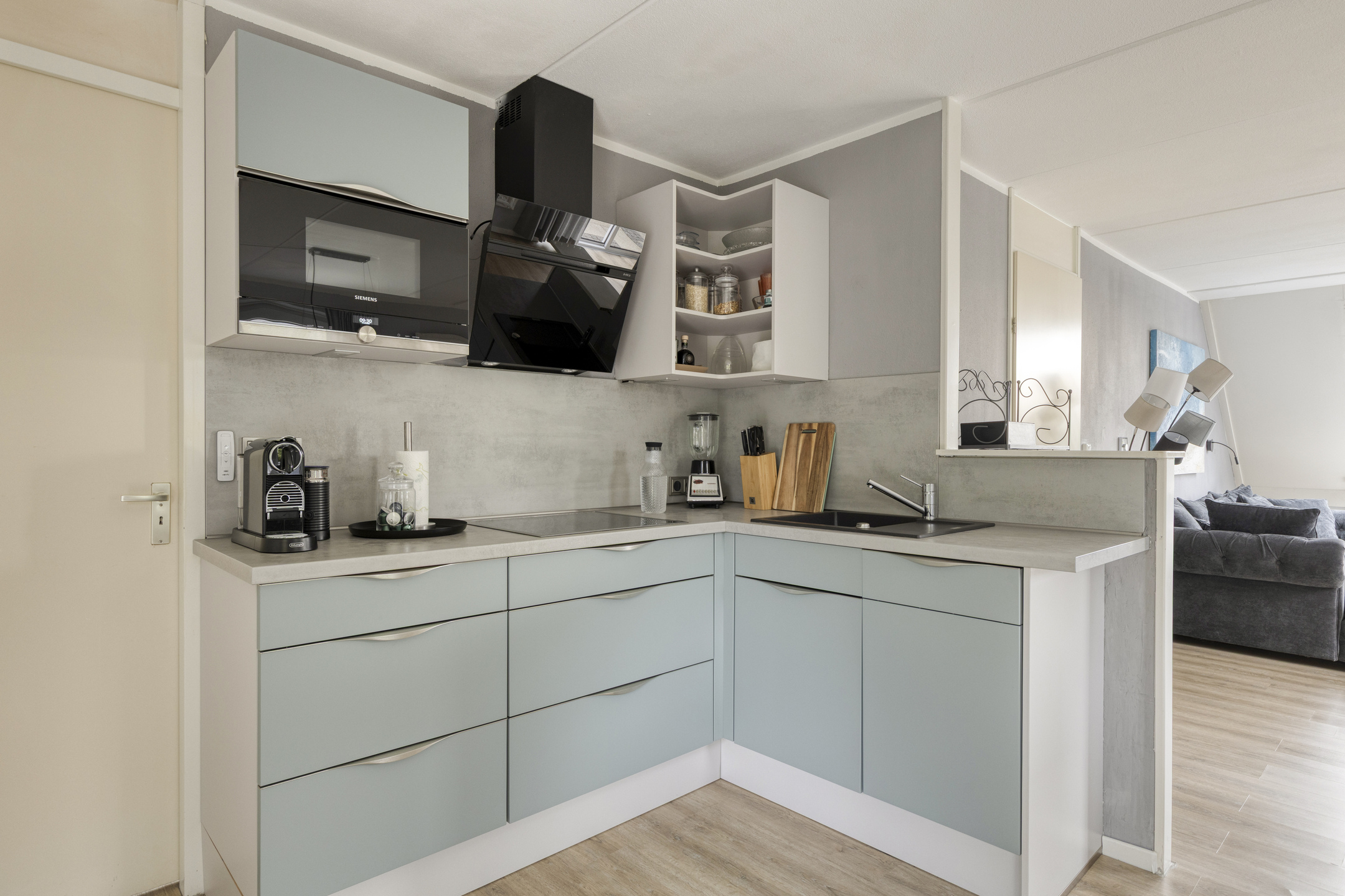 Via de zijkant van de woning bereik je via de voordeur de entree, van waaruit je toegang hebt tot de moderne badkamer, apart toilet en de woonkamer. De lichte woonkamer loopt over in de eetkamer met aansluitend de open keuken. Vanuit de woonkamer en eetkamer bereik je via een schuifpui de achtertuin met overkapping. Vanuit de keuken en via buiten is er nog toegang tot de inpandige berging met witgoedaansluiting en de cv-ketel.