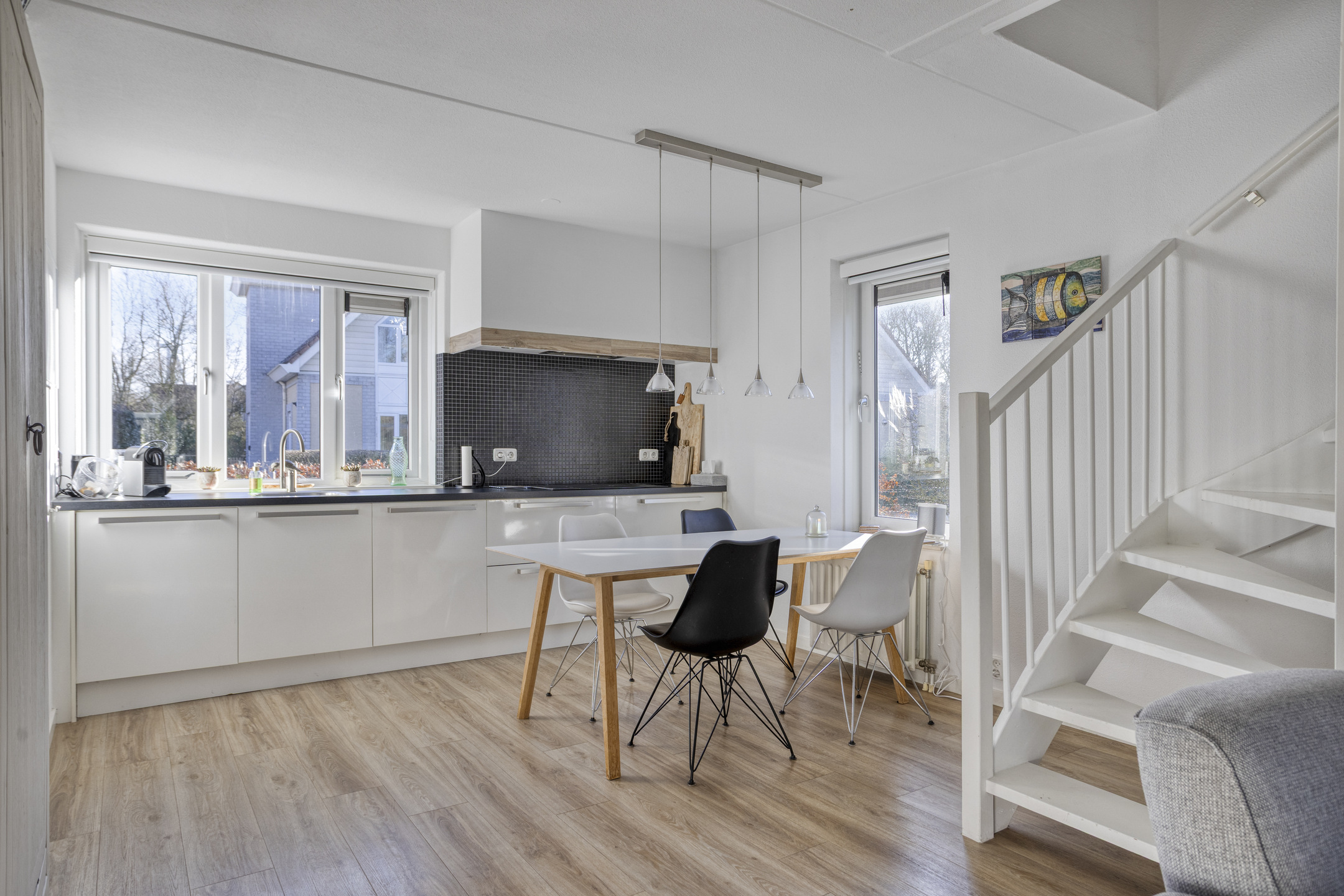Via de entree kom je binnen in de hal met toilet en toegang tot de woonkamer en open keuken. De moderne open keuken is voorzien van diverse inbouwapparatuur en staat in directe verbinding met de lichte woonkamer. In de woonkamer zorgen de openslaande deuren voor een prettige verbinding met de tuin. Vanuit de woonkamer is tevens de bijkeuken bereikbaar, welke ook een eigen buitendeur heeft, ideaal voor extra opslag of praktische doeleinden.