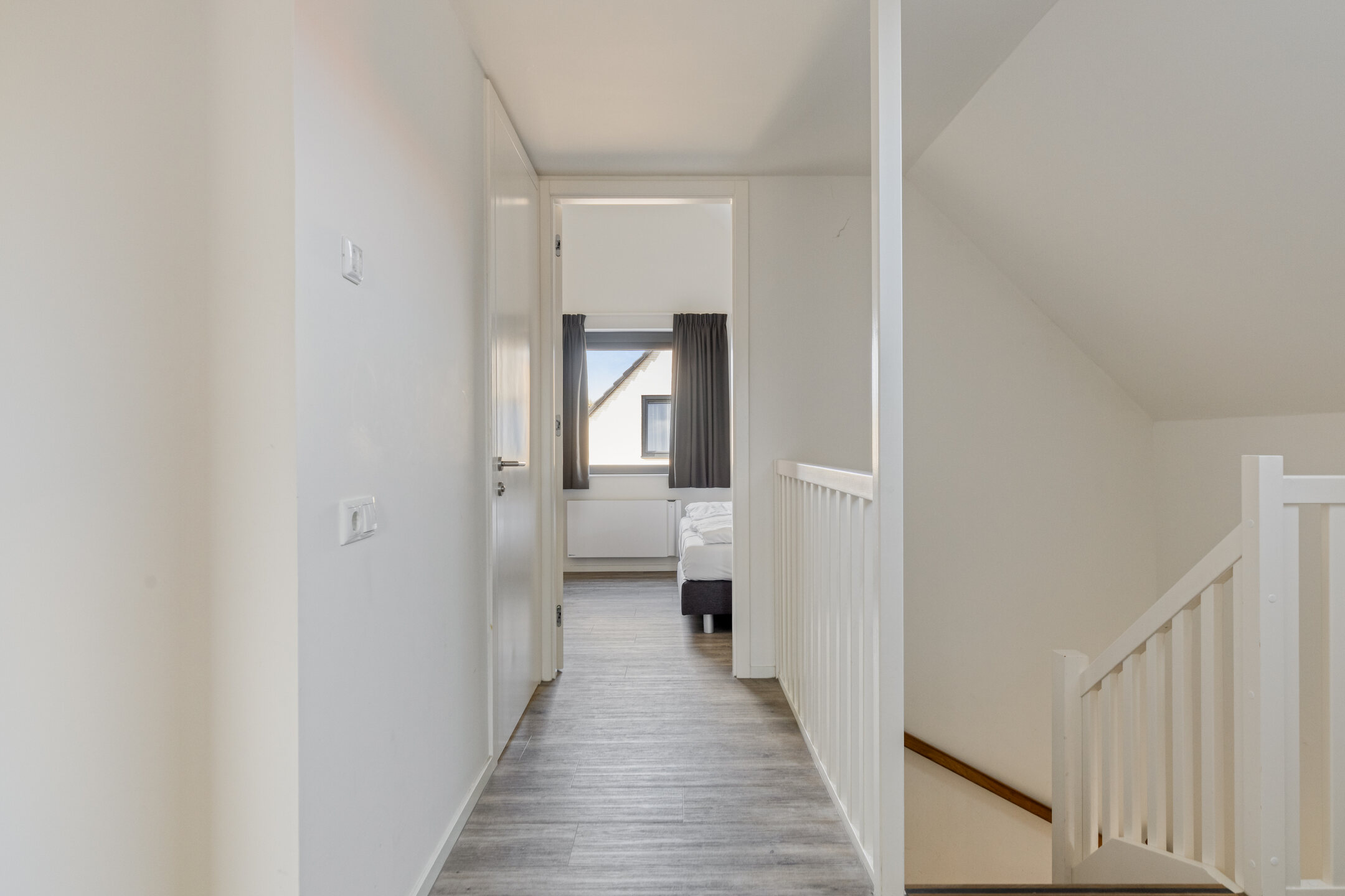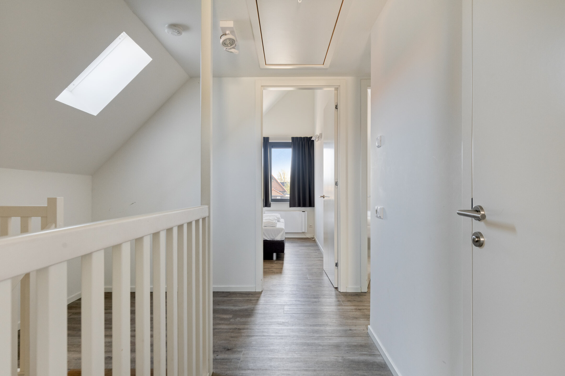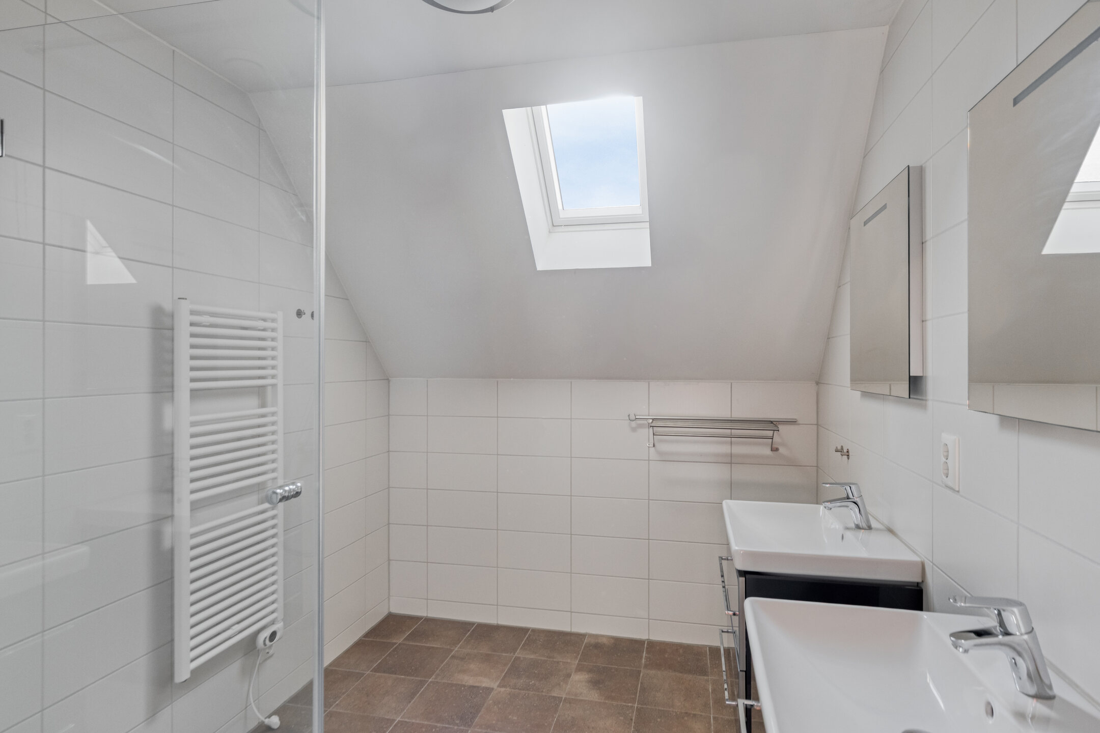Via de trap bereikt u de ruime overloop met dakraam en met toegang tot drie slaapkamers. Verder een badkamer met dubbele wastafelmeubel, inloopdouche en dakraam en een apart gelegen tweede toilet met wastafel. Vanuit de grootste slaapkamer heeft u toegang tot een naastgelegen berging met extra opslagruimte en aansluitingen voor witgoed en de warmtepompinstallatie.