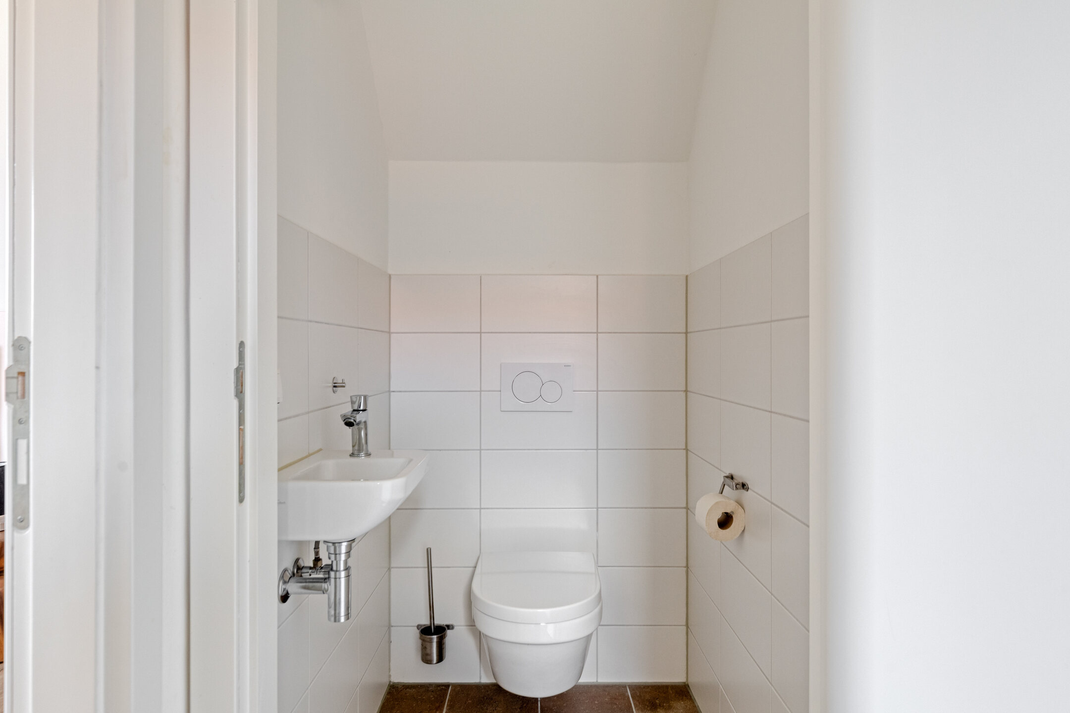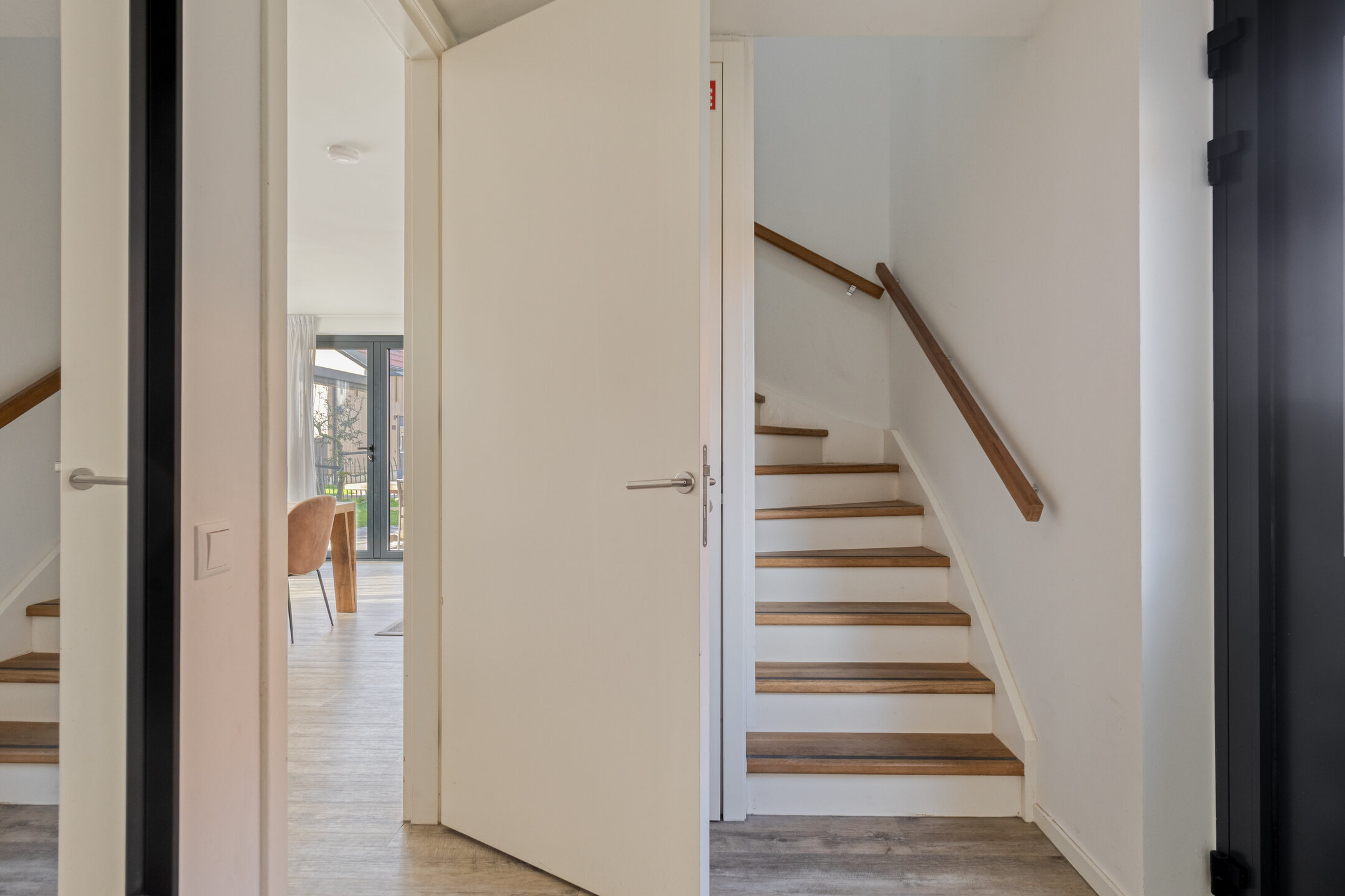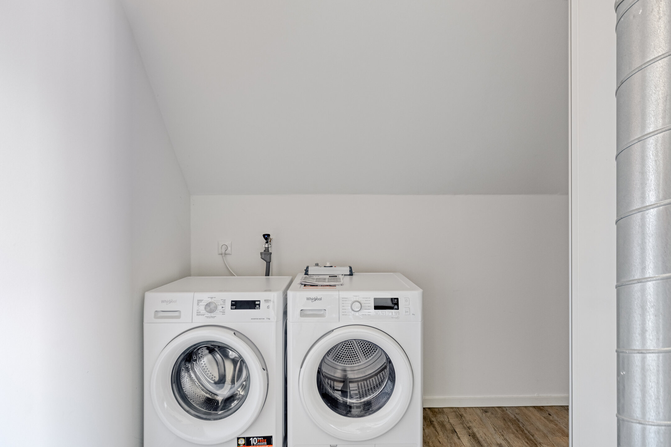 Via de trap bereikt u de ruime overloop met dakraam en met toegang tot drie slaapkamers. Verder een badkamer met dubbele wastafelmeubel, inloopdouche en dakraam en een apart gelegen tweede toilet met wastafel. Vanuit de grootste slaapkamer heeft u toegang tot een naastgelegen berging met extra opslagruimte en aansluitingen voor witgoed en de warmtepompinstallatie.