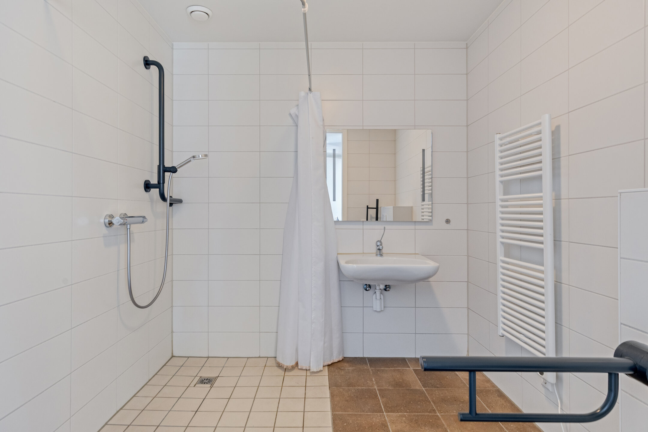 U betreedt de woning via een ruime entree met toegang tot de meterkast, een slaapkamer met tuindeuren, de trapopgang naar de eerste verdieping en een praktische bergkast onder de trap. De badkamer met douche, wastafel en toilet zijn ingericht voor mindervaliden met een douche- en toiletbeugel.