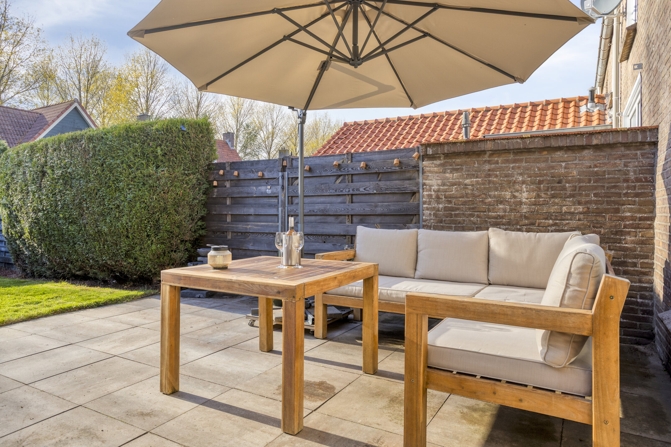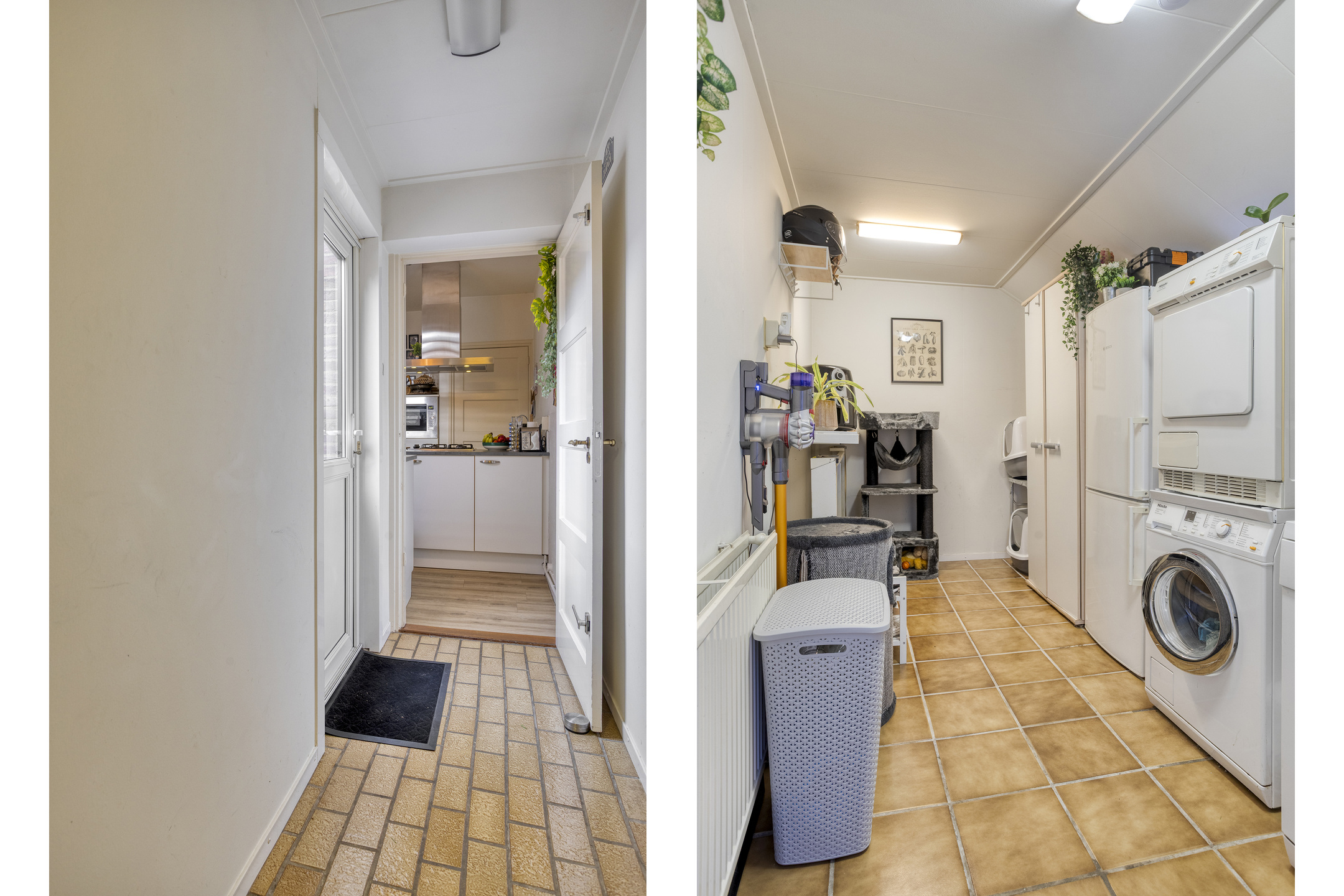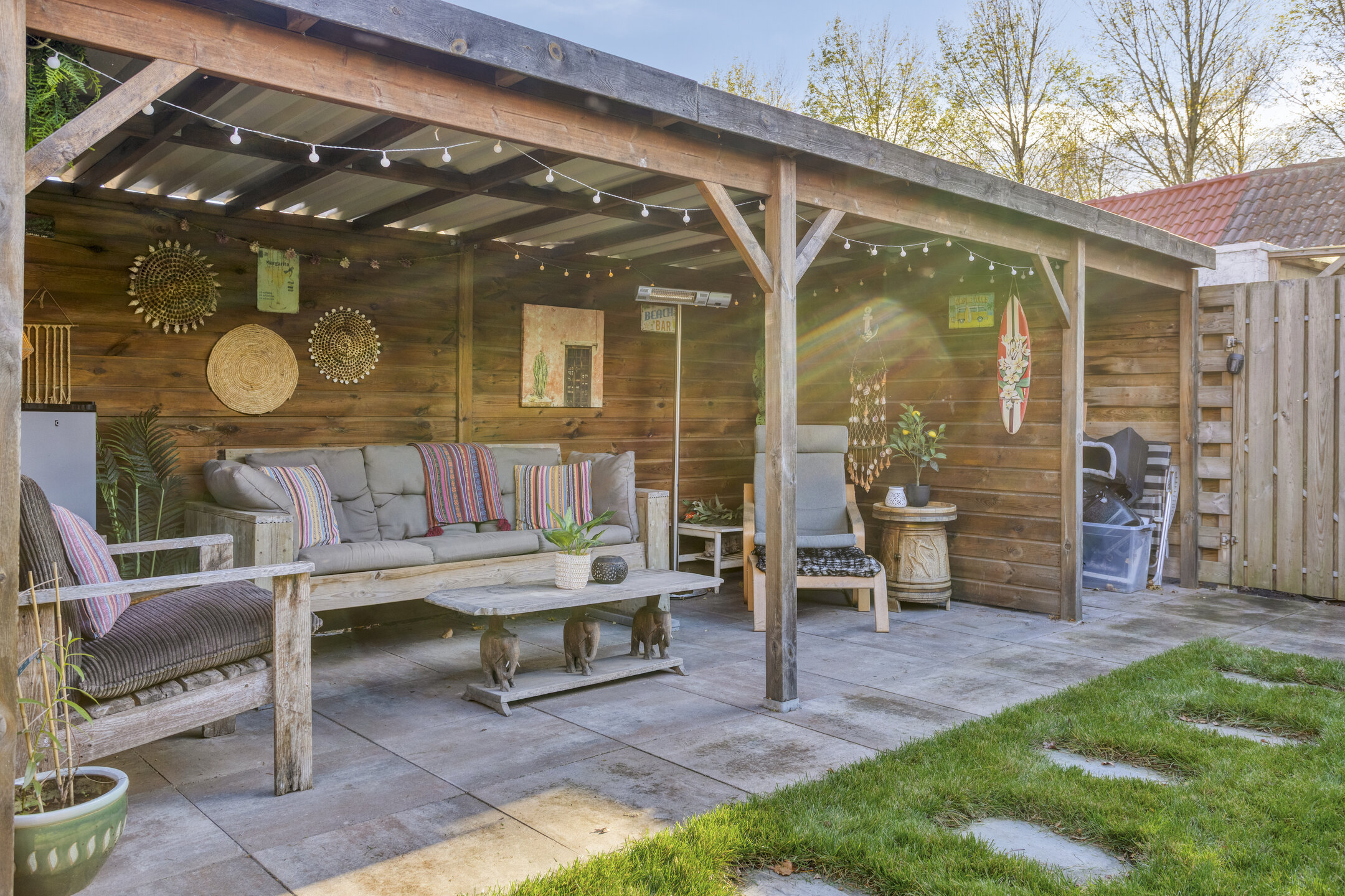 Vanuit de gang naar de bijkeuken bereik je de achtertuin. Deze is ideaal gelegen op het zuidwesten. Achter de bijkeuken is nog een fijne overkapping gerealiseerd en via de poort kun je ook aan de achterkant van de woning komen.