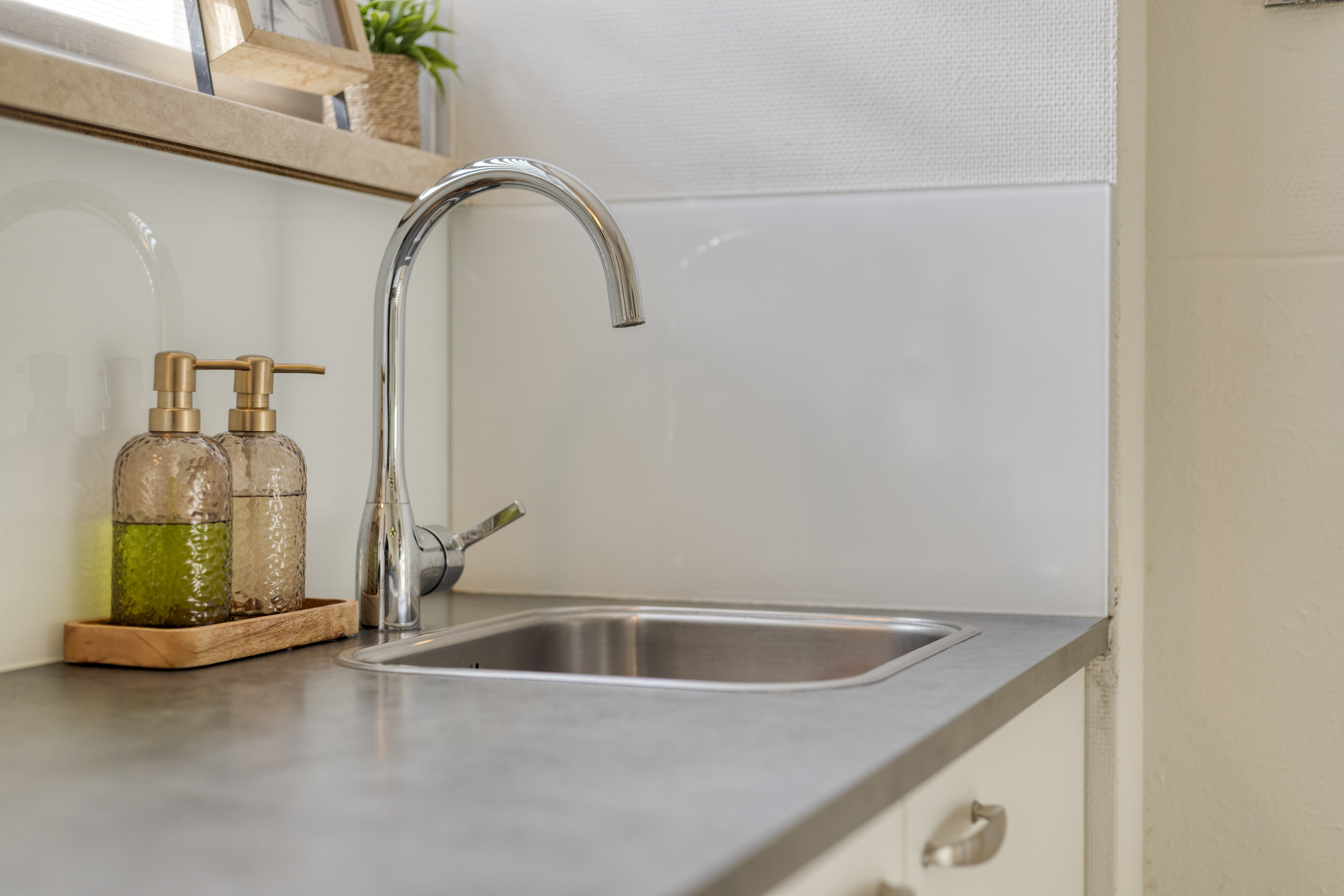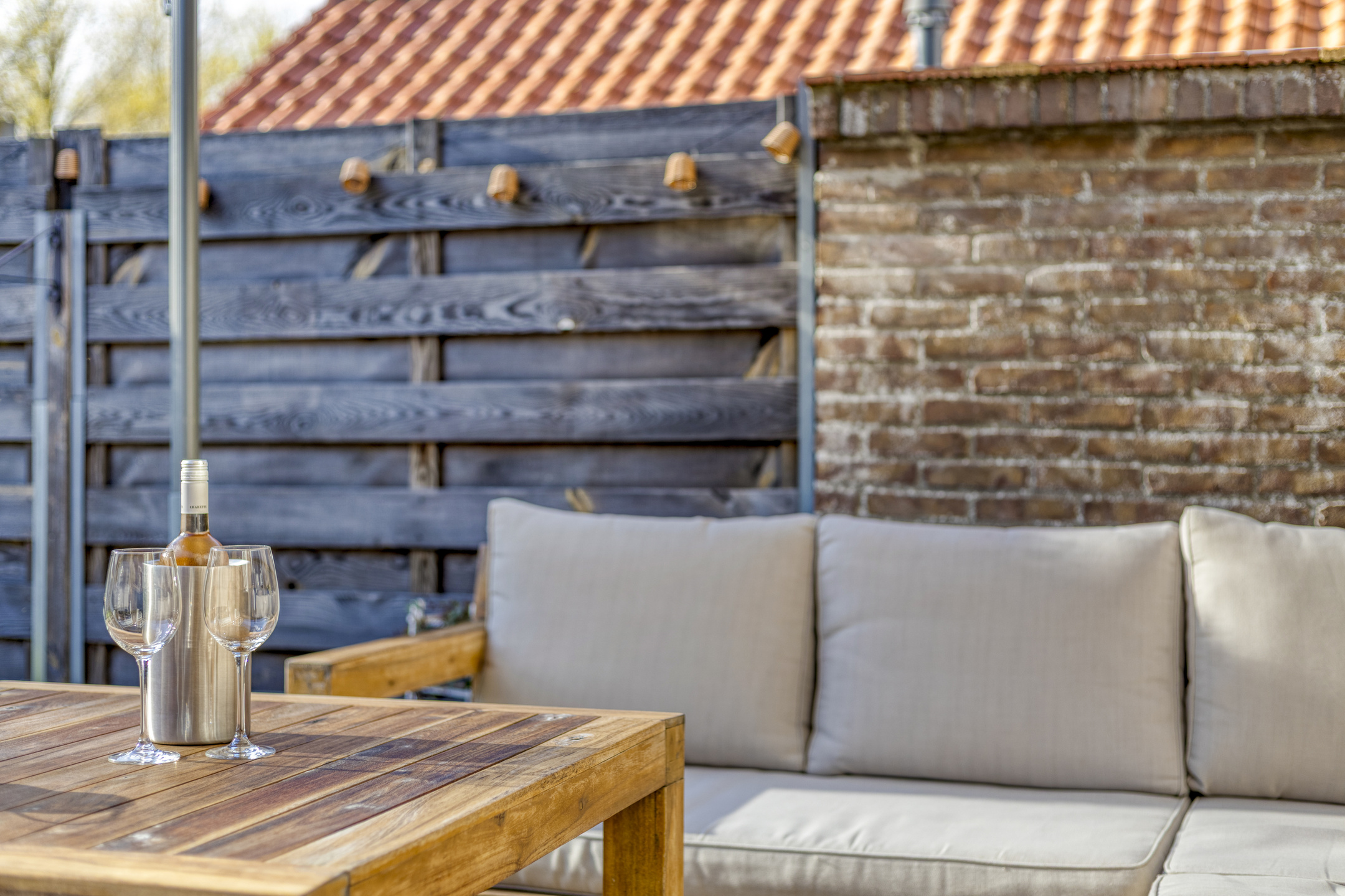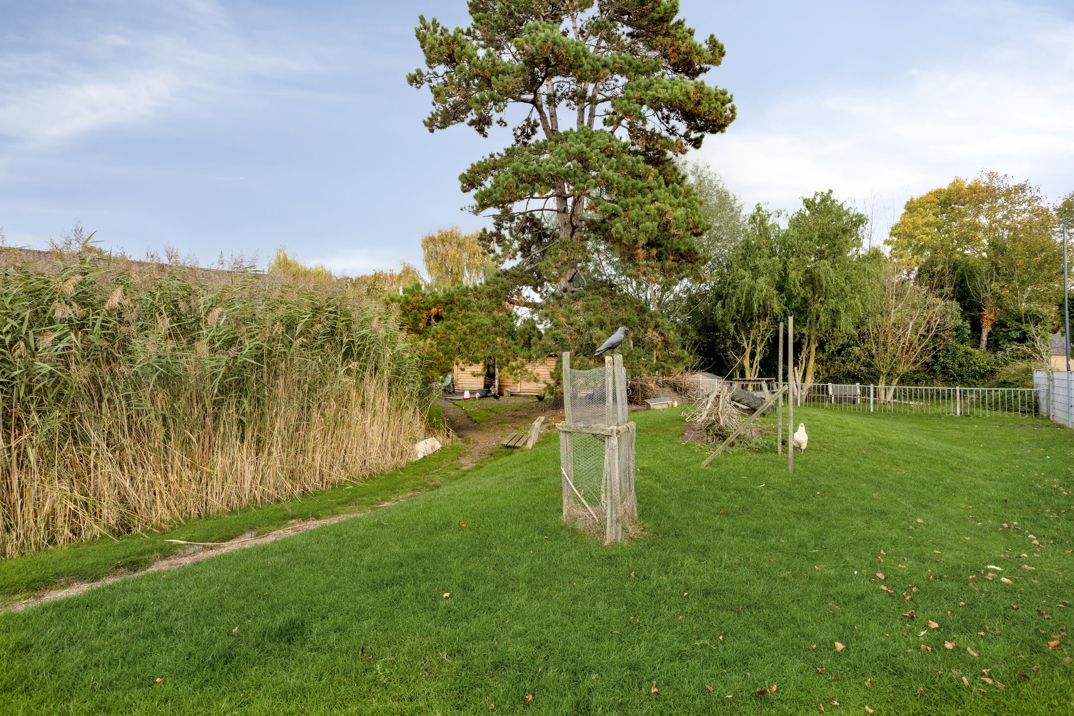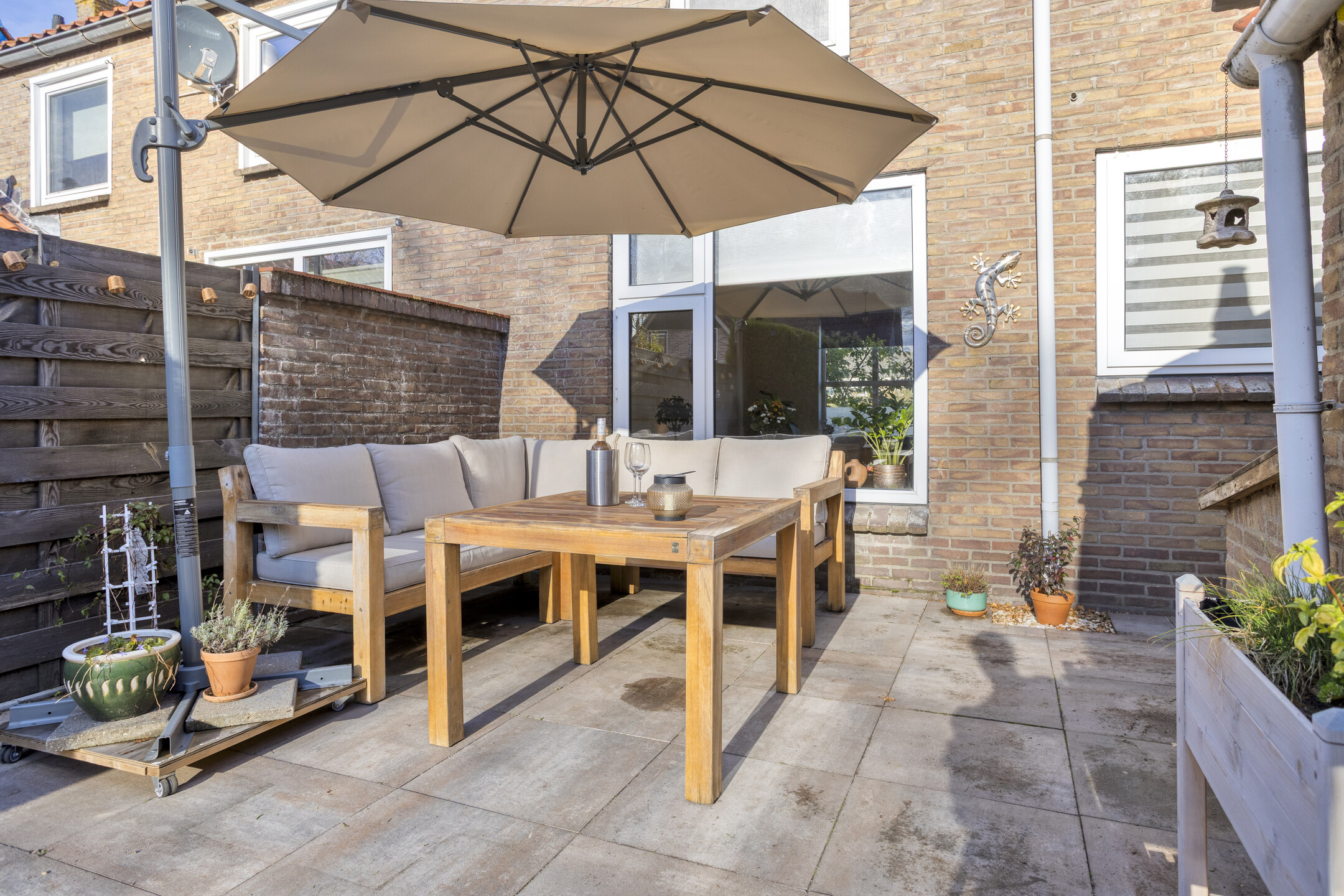 Vanuit de gang naar de bijkeuken bereik je de achtertuin. Deze is ideaal gelegen op het zuidwesten. Achter de bijkeuken is nog een fijne overkapping gerealiseerd en via de poort kun je ook aan de achterkant van de woning komen.