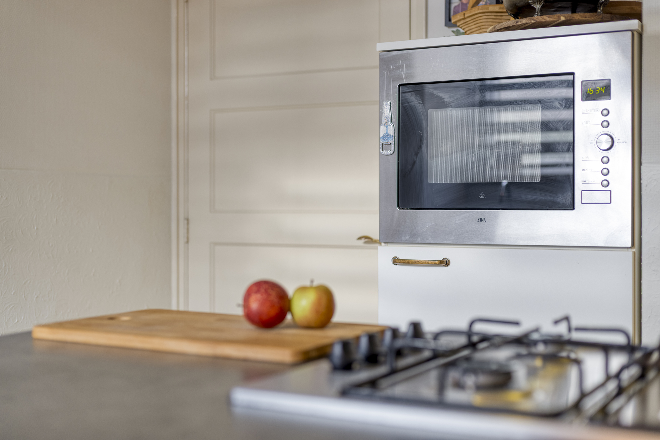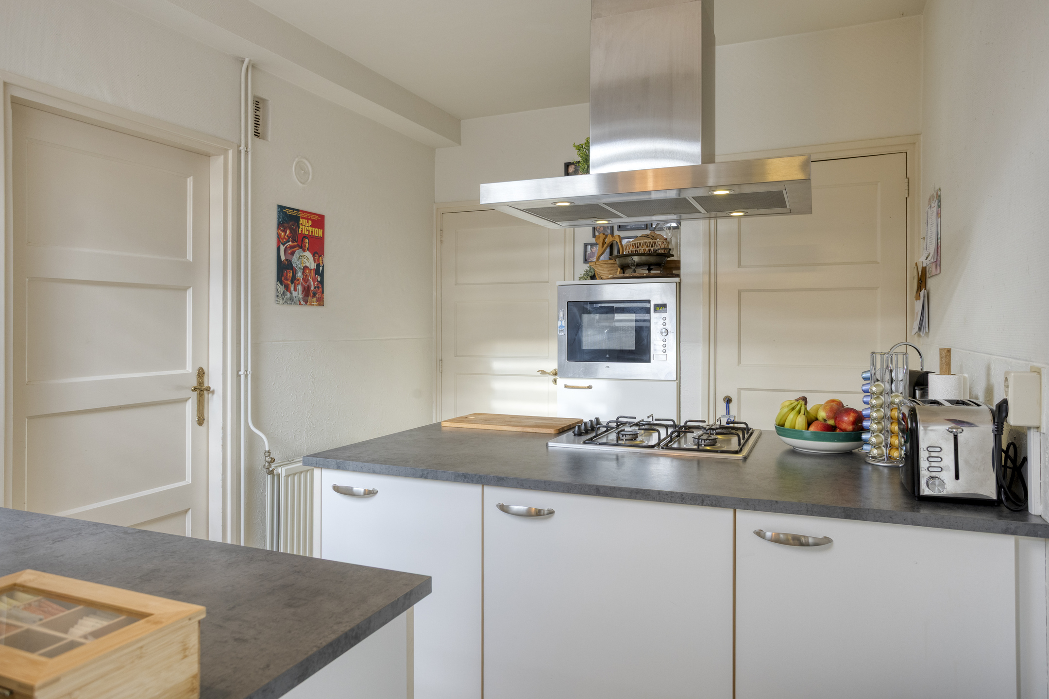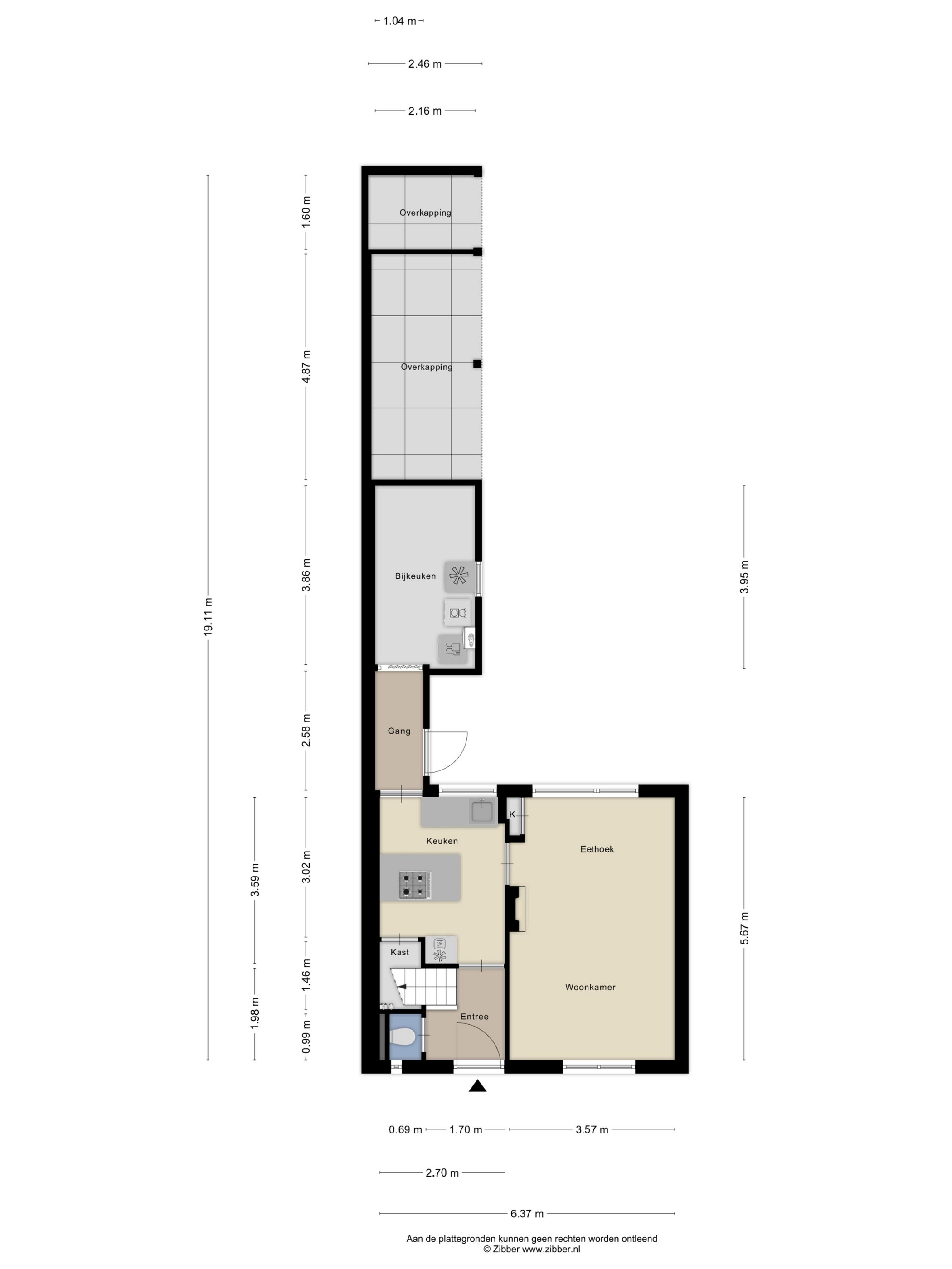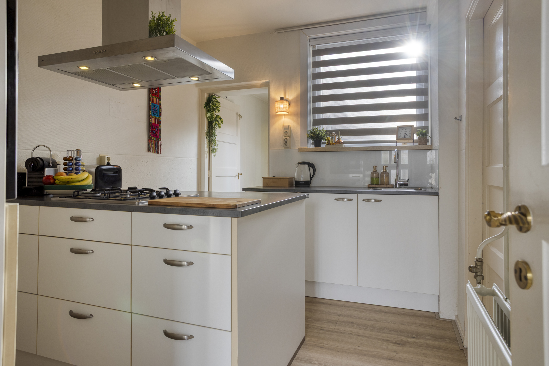 Via de voorzijde van de woning bereik je de entree, van waaruit je toegang hebt tot het toilet en de keuken. De keuken is voorzien van diverse inbouwapparatuur en inbouwkasten. Via de deur in de keuken bereik je de woonkamer en eetkamer. Via een andere deur in de keuken bereik je de gang van waaruit je toegang hebt tot de achtertuin en de bijkeuken met witgoedaansluiting.
